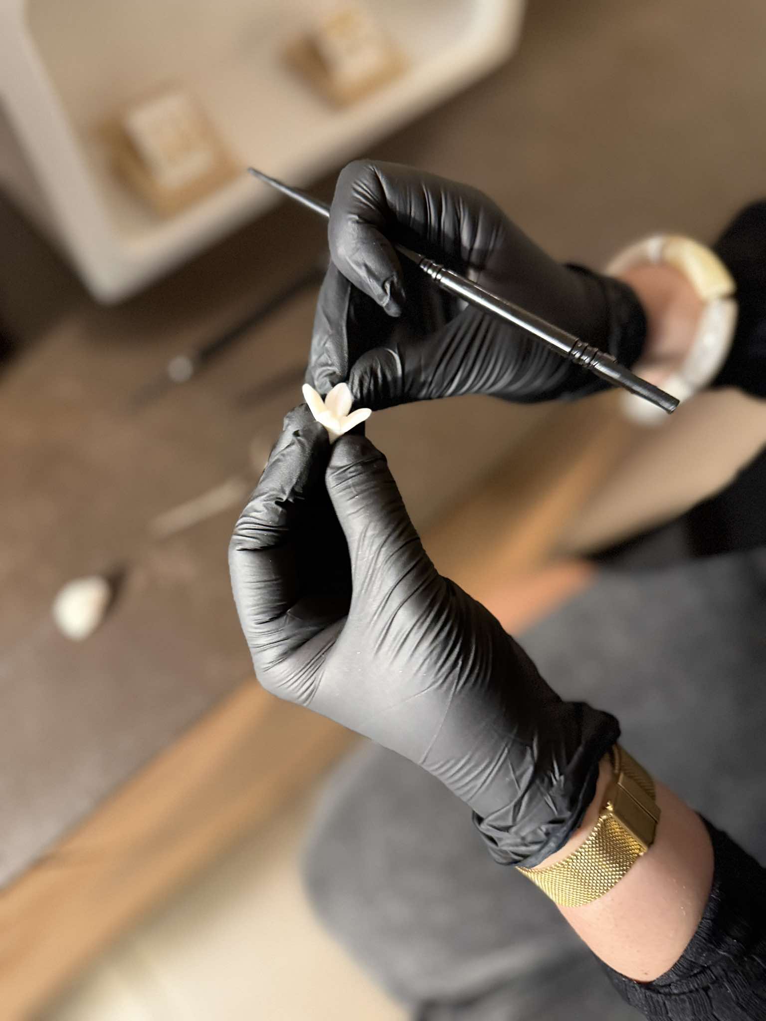 J’affectionne particulièrement la porcelaine froide, sculptée à la main et d’une légèreté unique, qui se marie très bien avec d’autres éléments tels que de véritables perles d’eau douce, des perles de verres ou encore des Perles Swarovski.