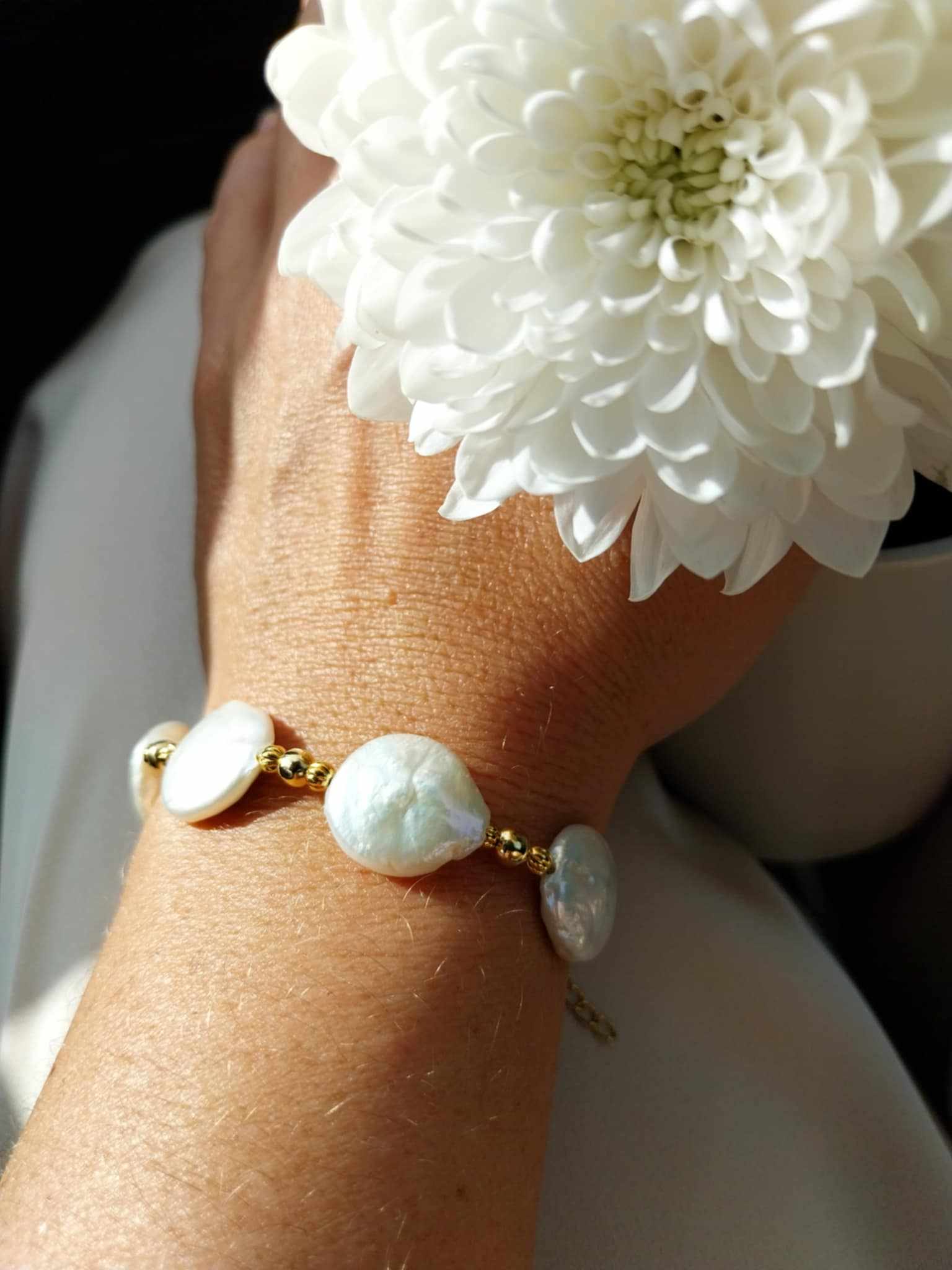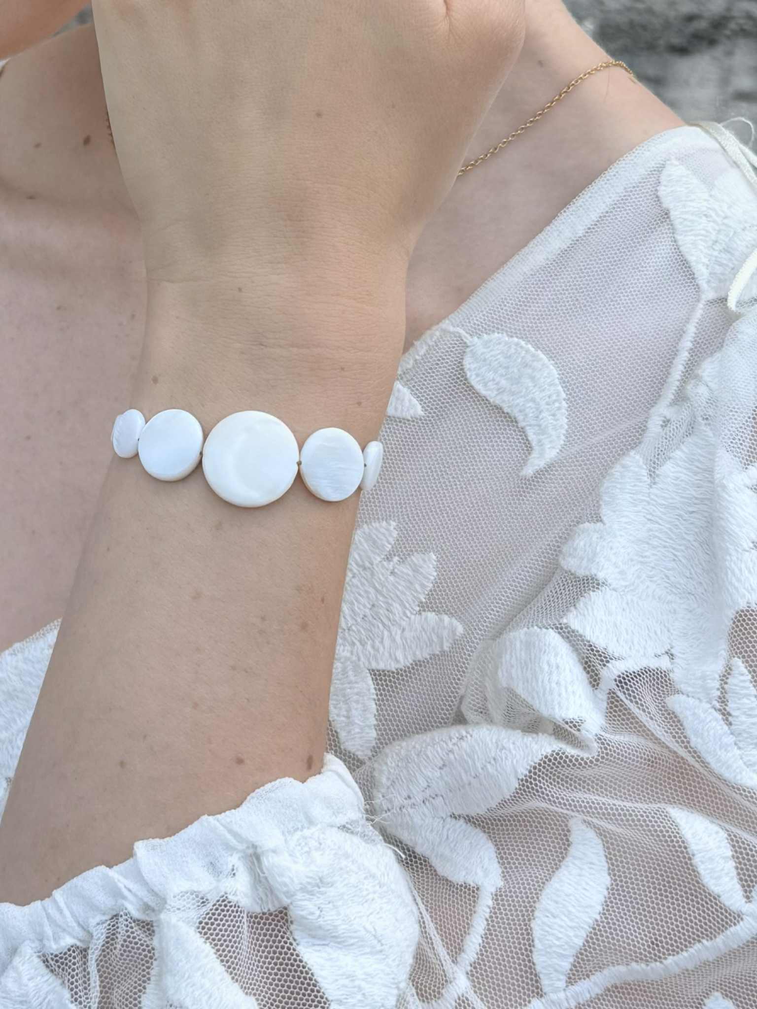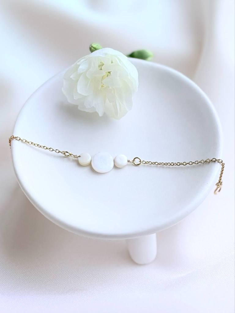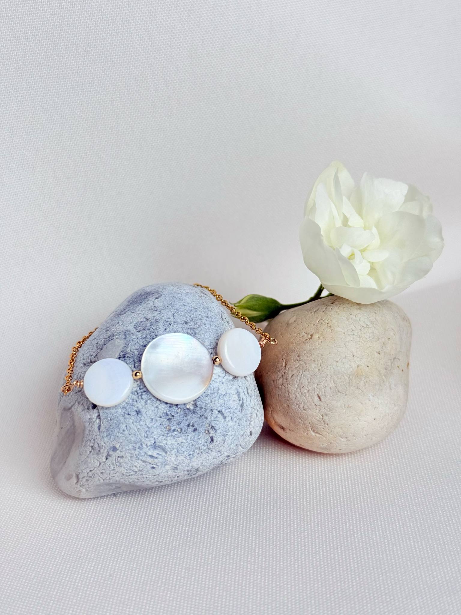 bracelet réglable – nacre de coquillage – 55 € – certains éléments en nacre peuvent comporter des nuances de beige et de brun, cela reste un élément naturel et ne sont donc pas des pièces identiques