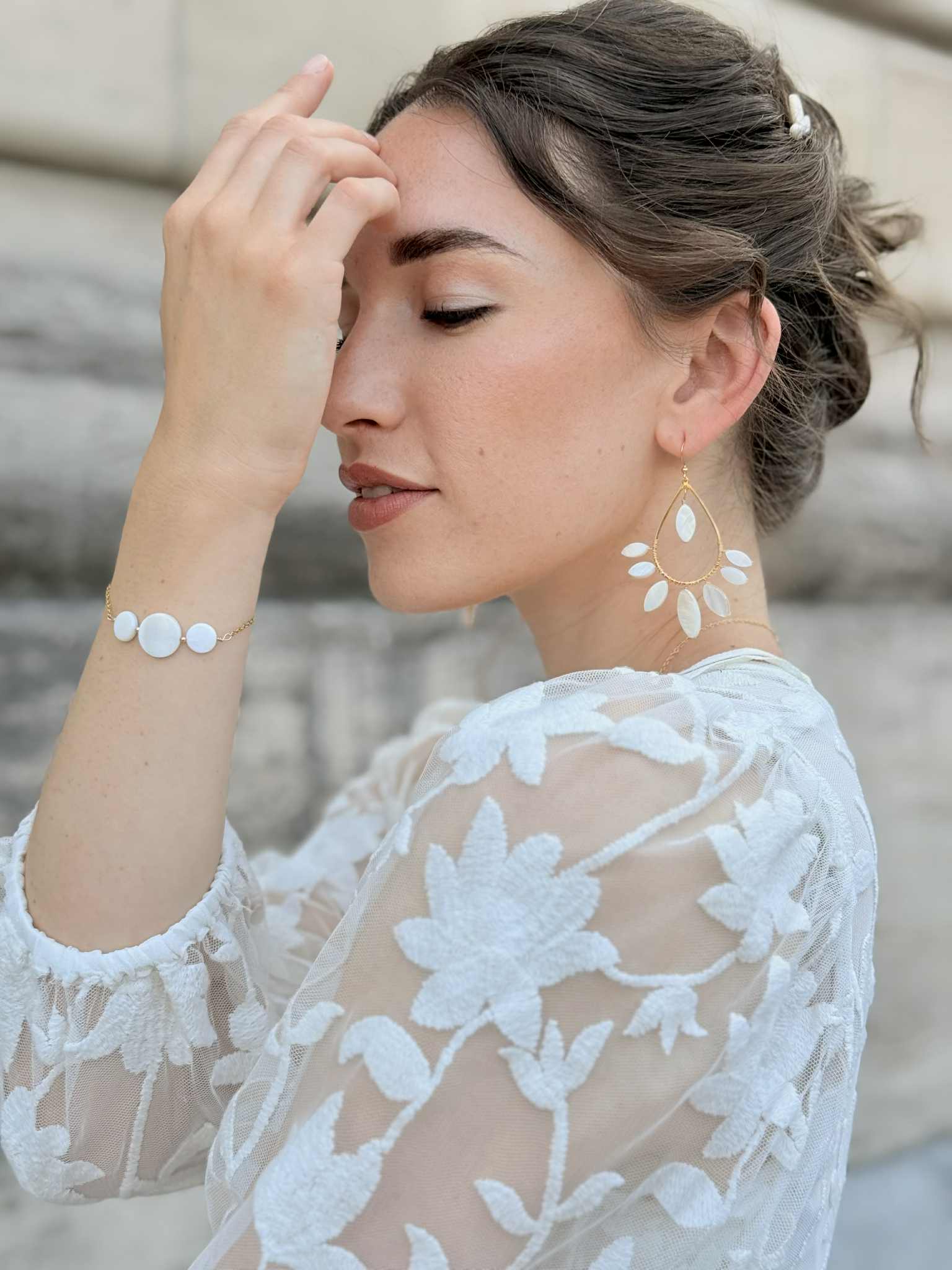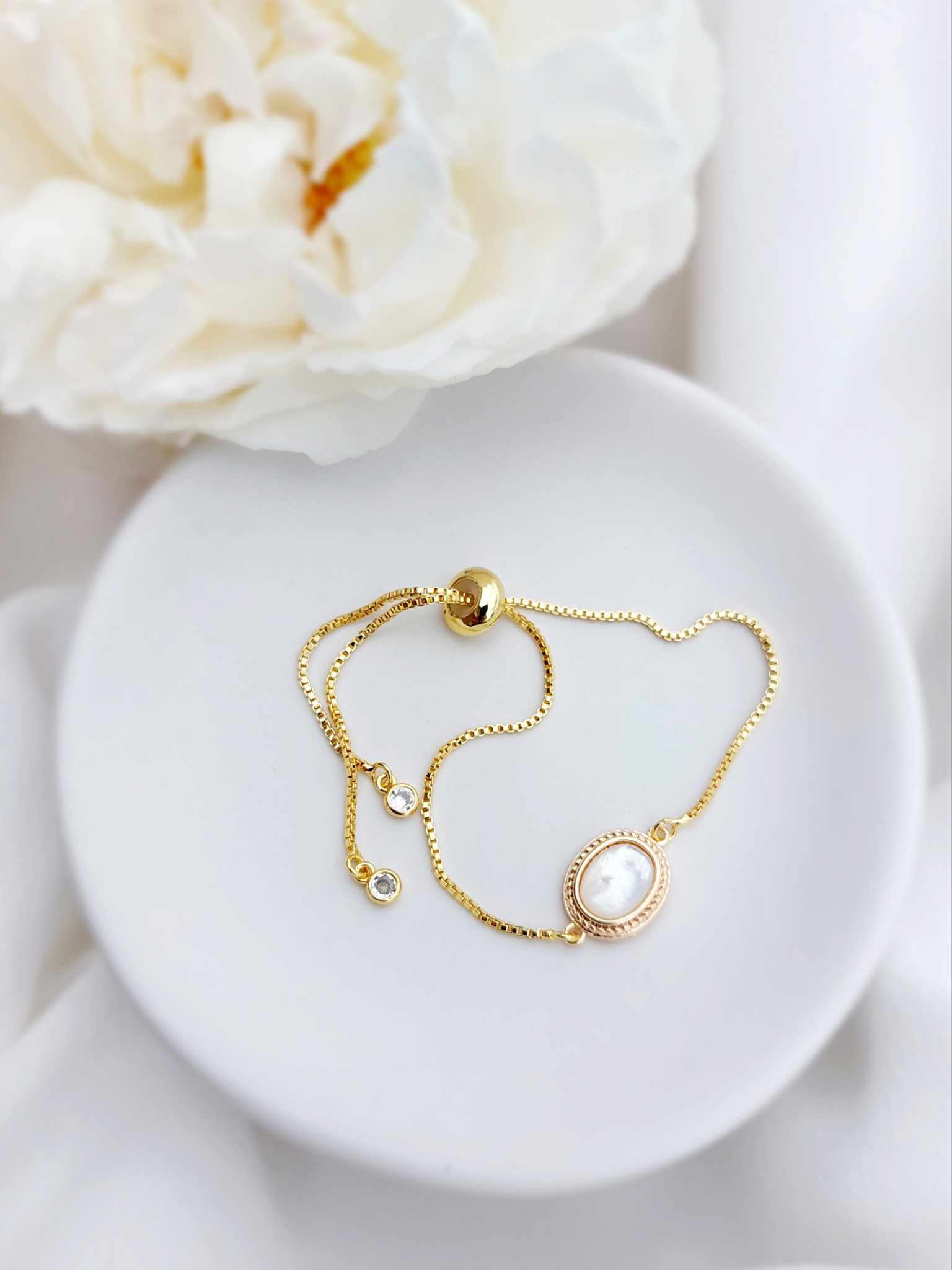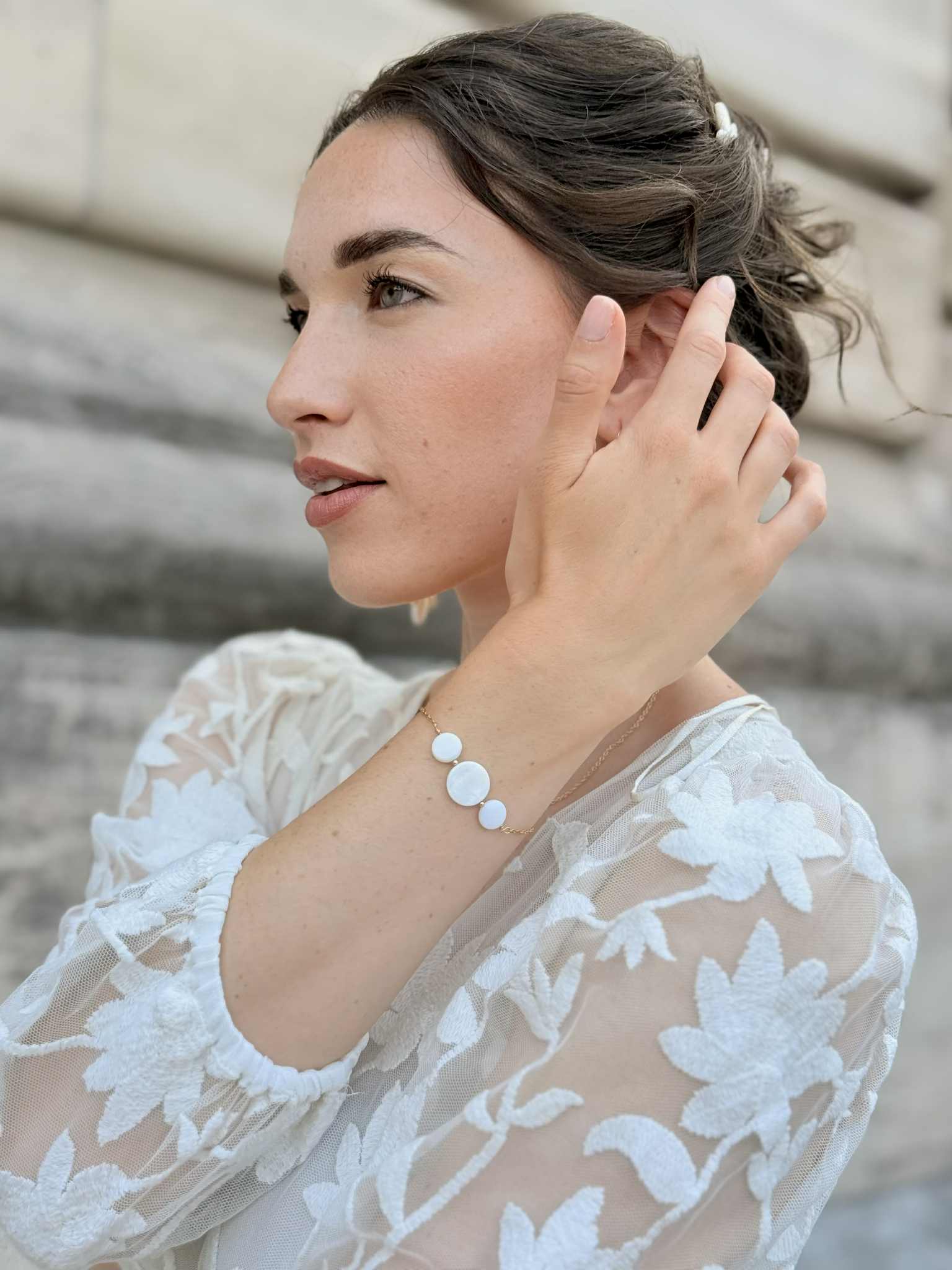 bracelet réglable – nacre de coquillage – 55 € – certains éléments en nacre peuvent comporter des nuances de beige et de brun, cela reste un élément naturel et ne sont donc pas des pièces identiques