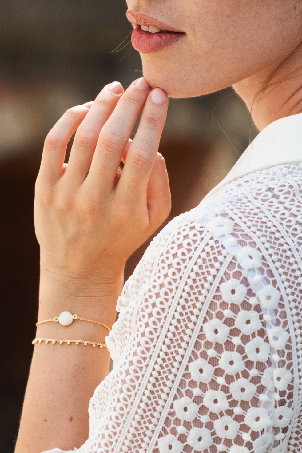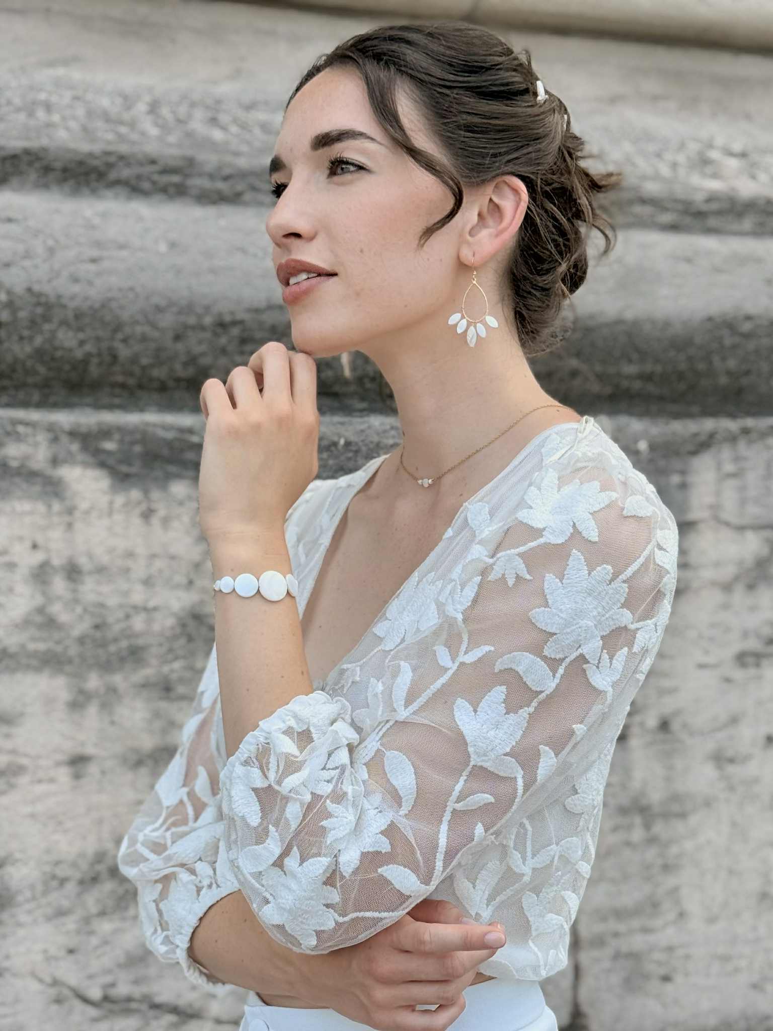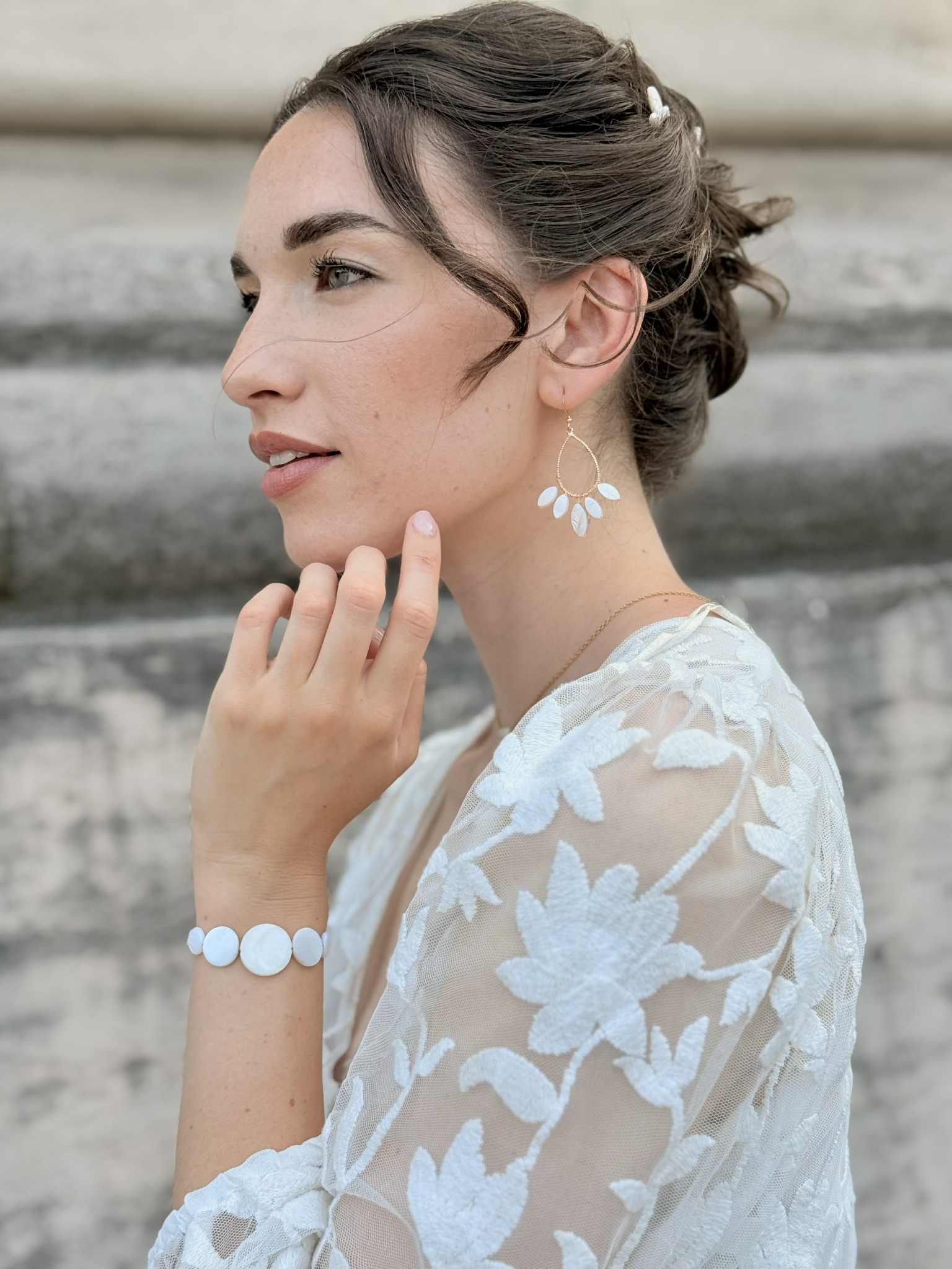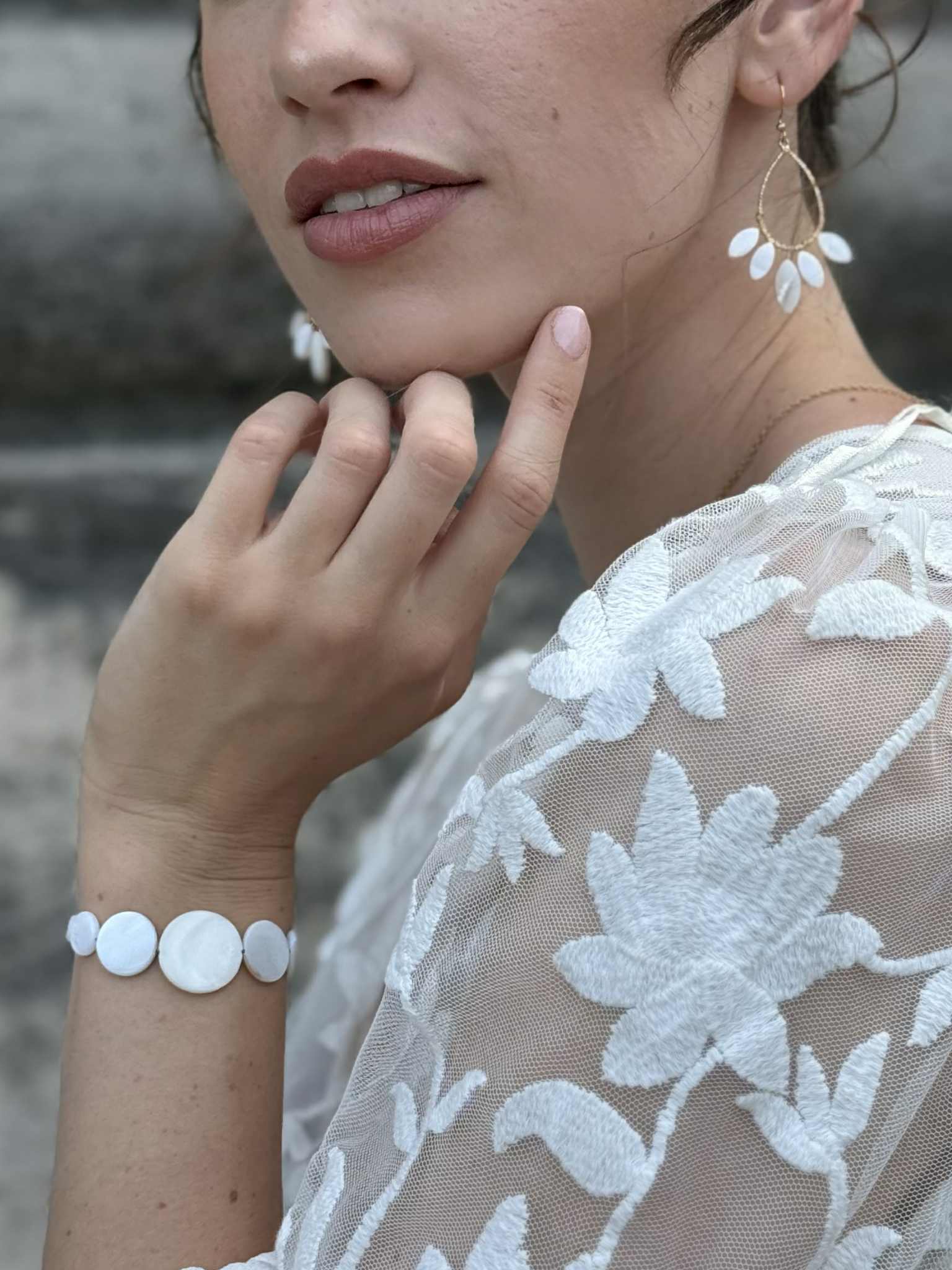 bracelet réglable – nacre de coquillage – 55 € – certains éléments en nacre peuvent comporter des nuances de beige et de brun, cela reste un élément naturel et ne sont donc pas des pièces identiques