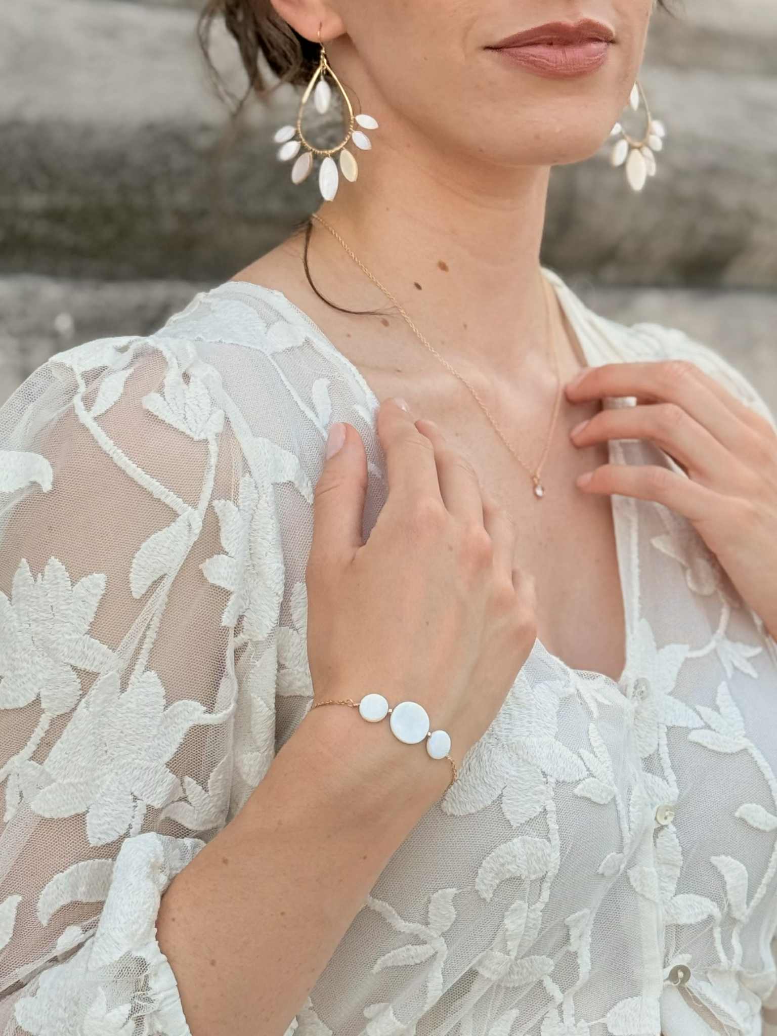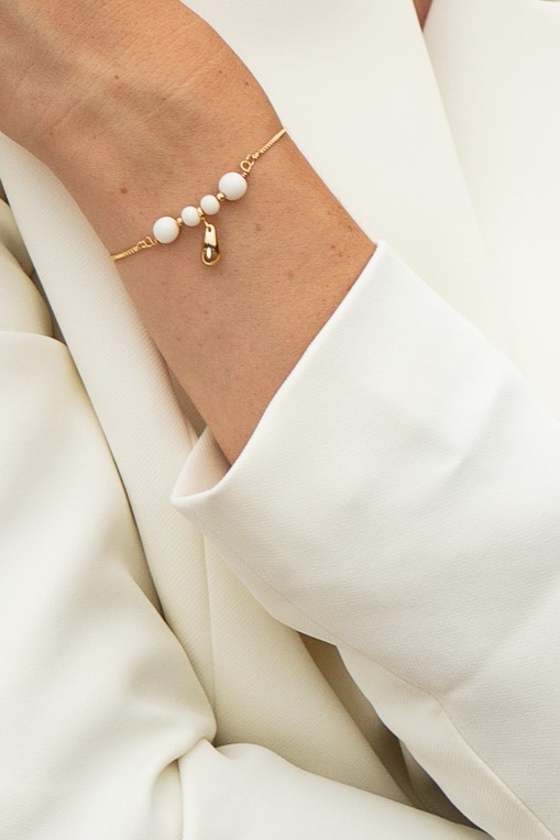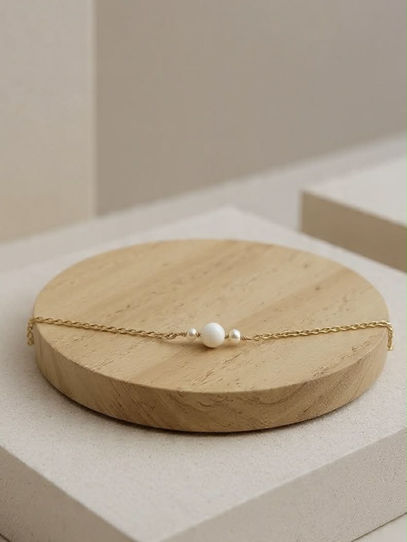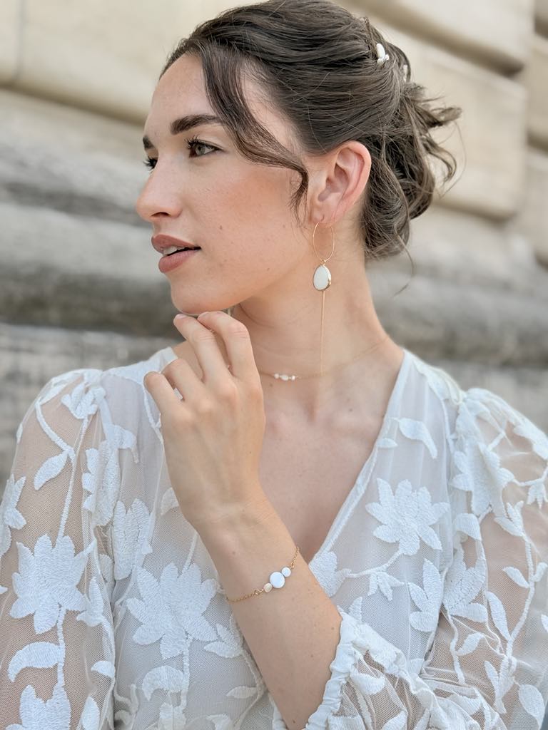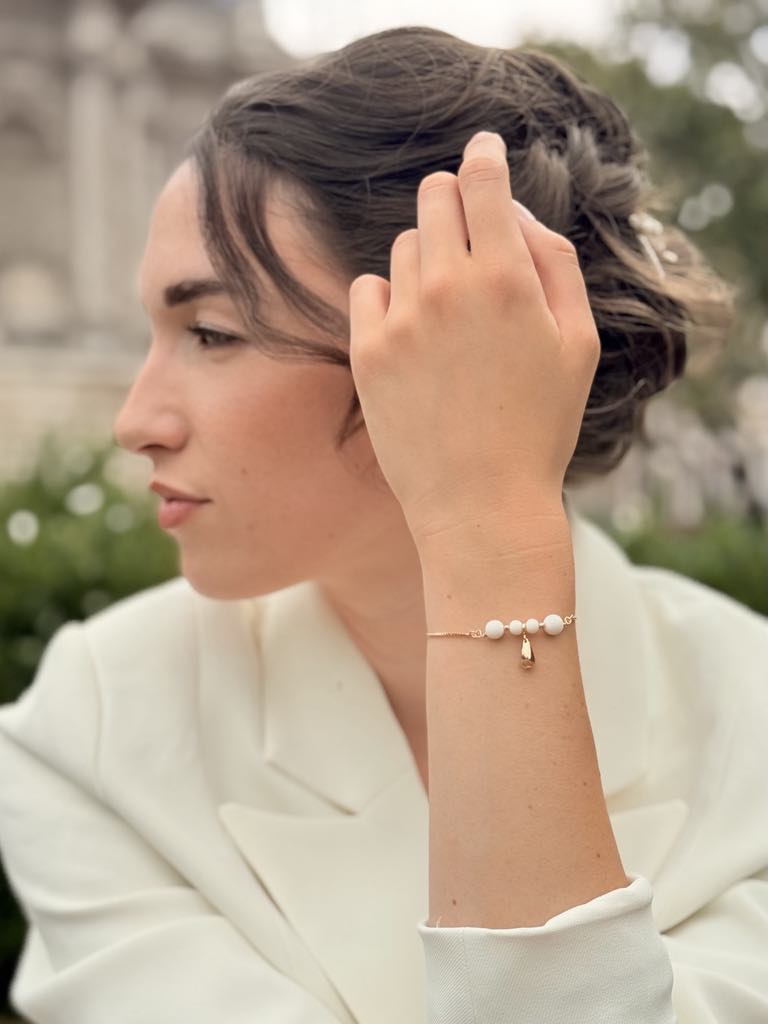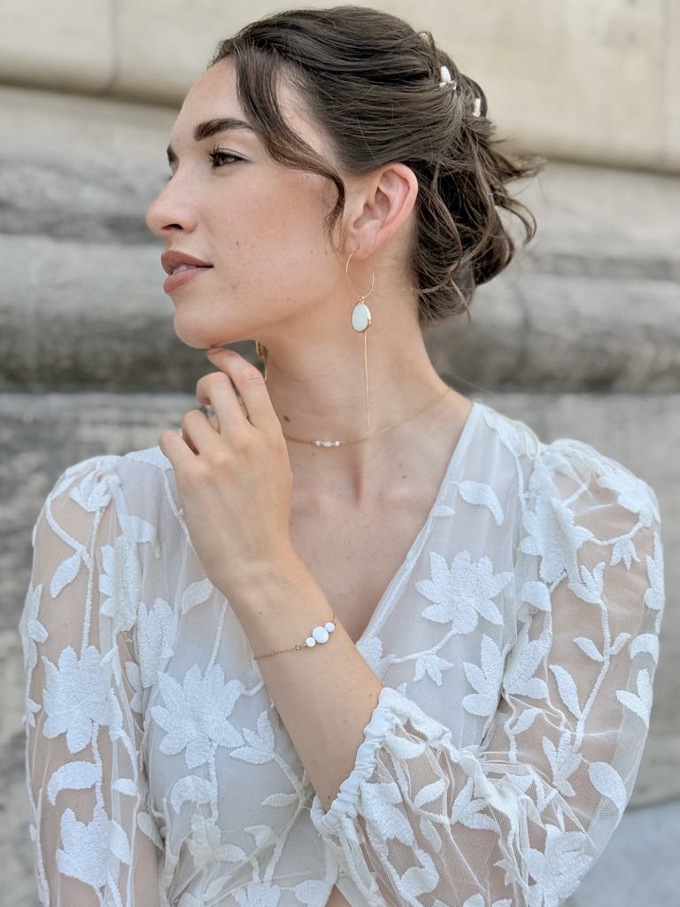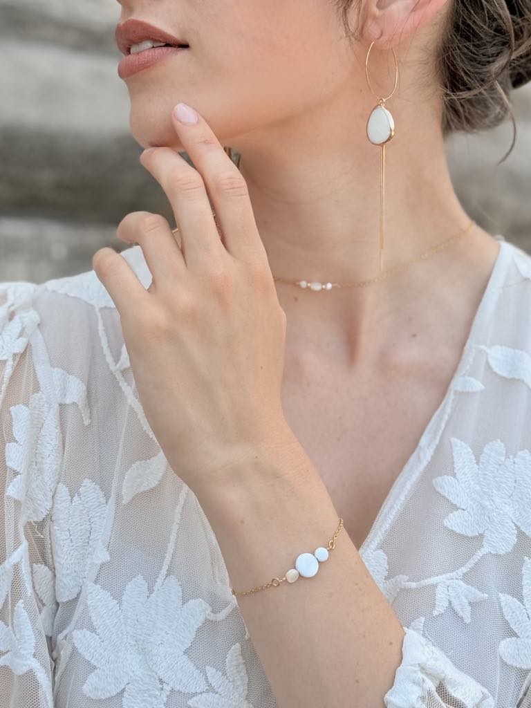 Bracelet avec trois perles en nacre de coquillage – 40 € – *certains éléments en nacre peuvent comporter des nuances de beige et de brun, cela reste un élément naturel et ne sont donc pas des pièces identiques