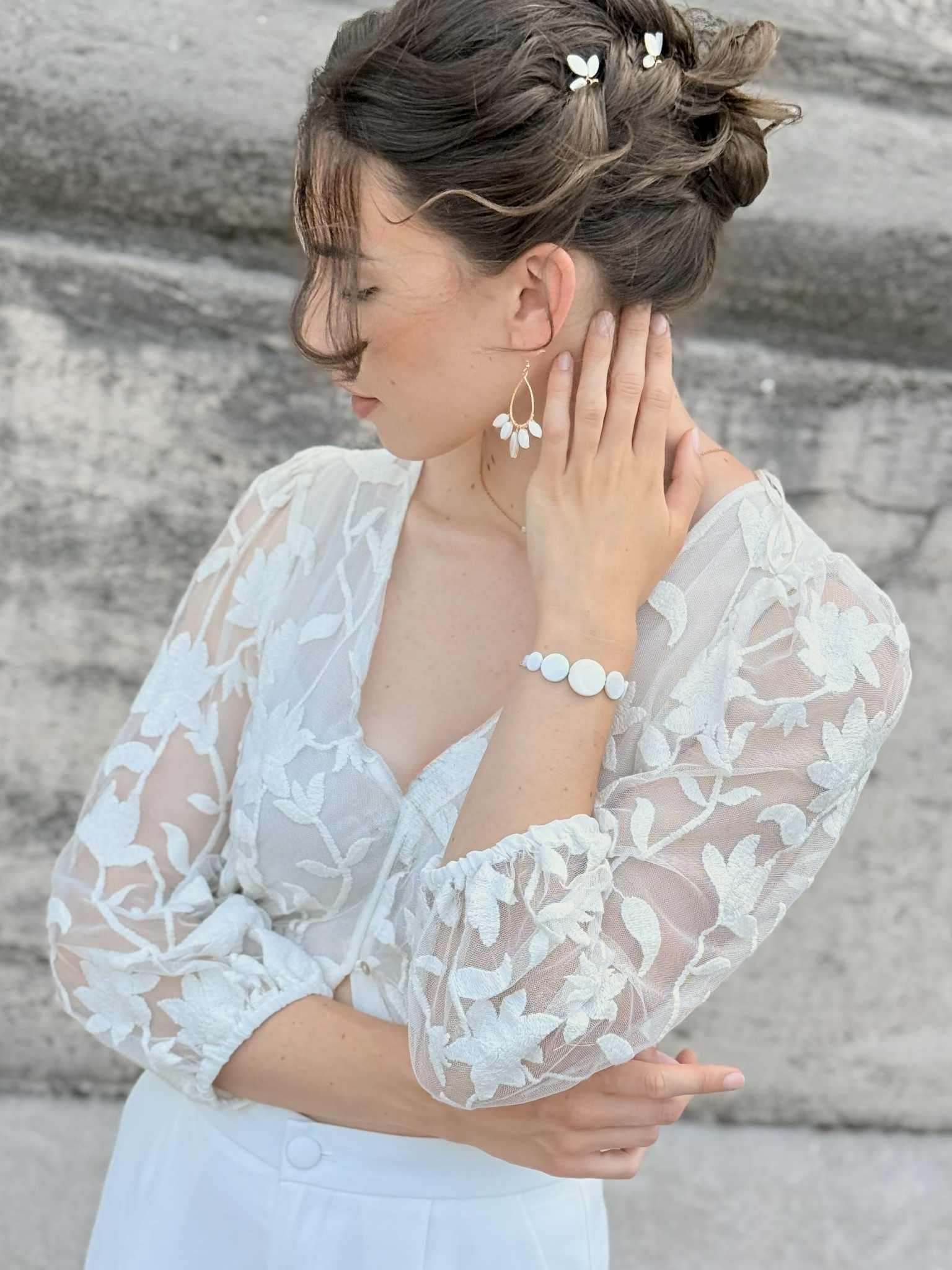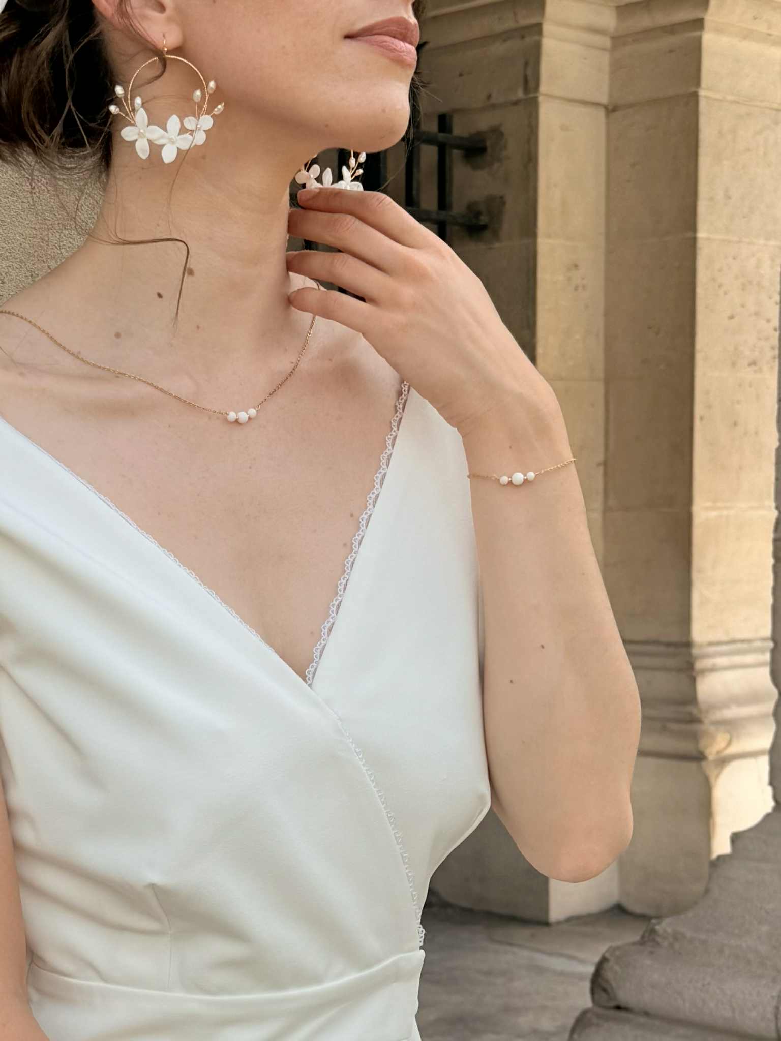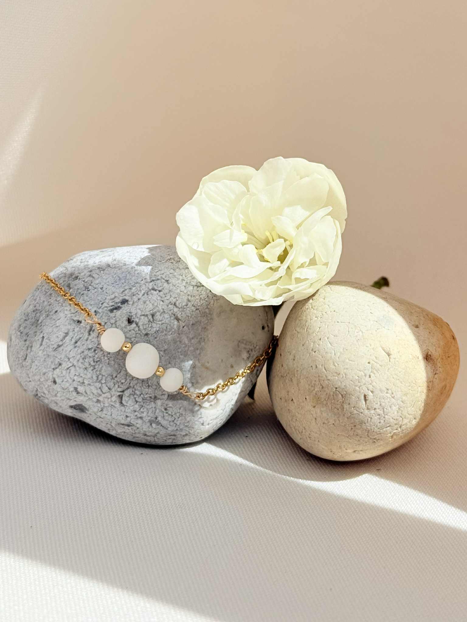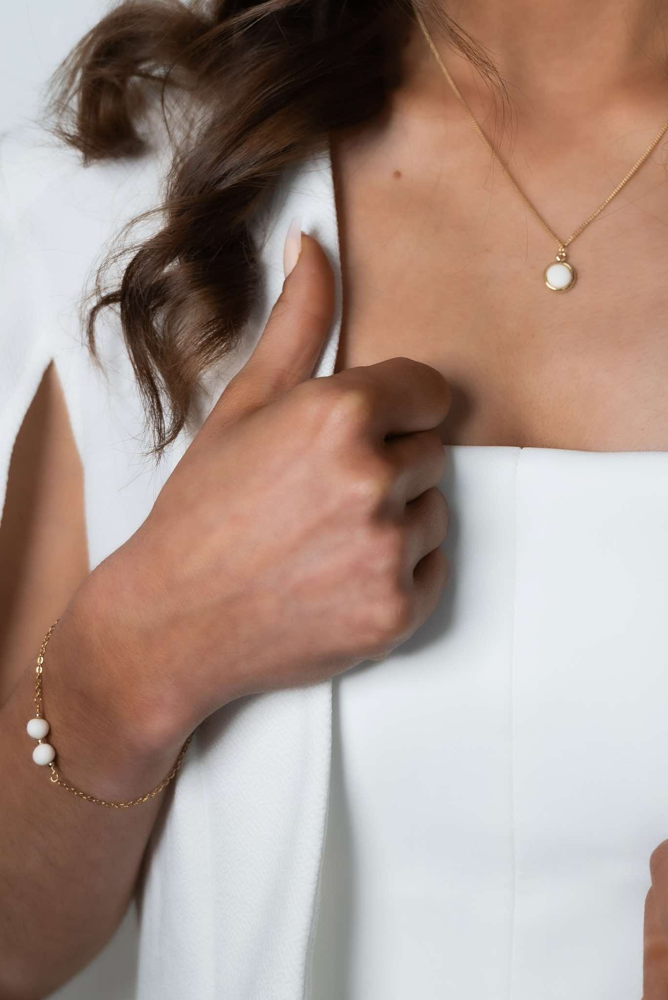 Bracelet avec trois perles en nacre de coquillage – 40 € – *certains éléments en nacre peuvent comporter des nuances de beige et de brun, cela reste un élément naturel et ne sont donc pas des pièces identiques