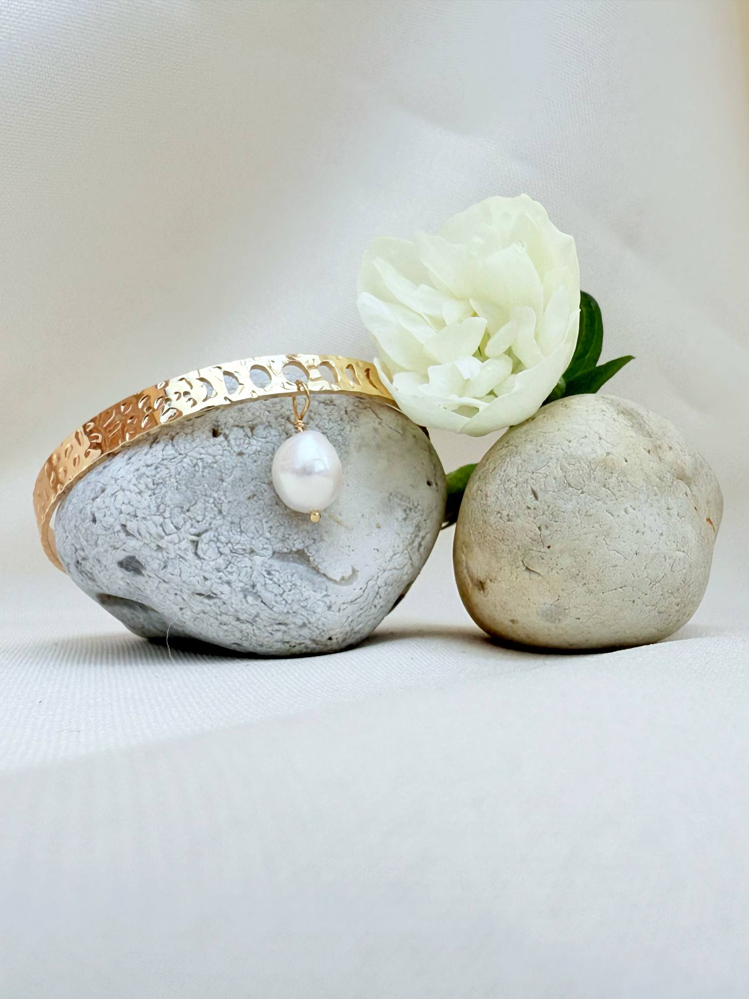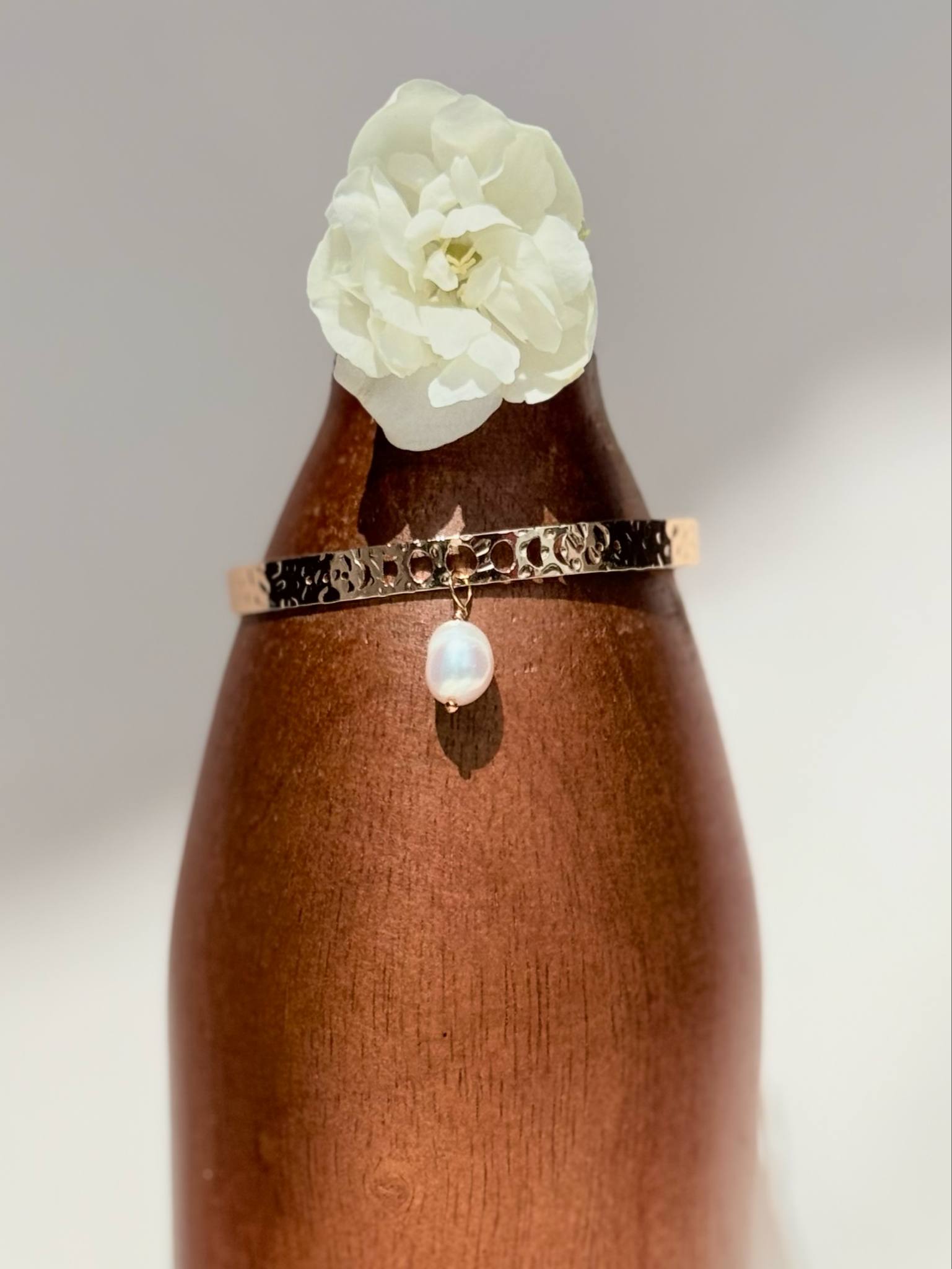 bracelet jonc avec les phases de la lune & sa perle d’eau douce tombante – 40 € –