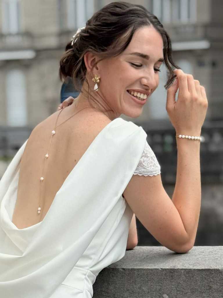 nacre de coquillage et petite perles dorées – 45 € – certains éléments en nacre peuvent comporter des nuances de beige et de brun, cela reste un élément naturel et ne sont donc pas des pièces identiques