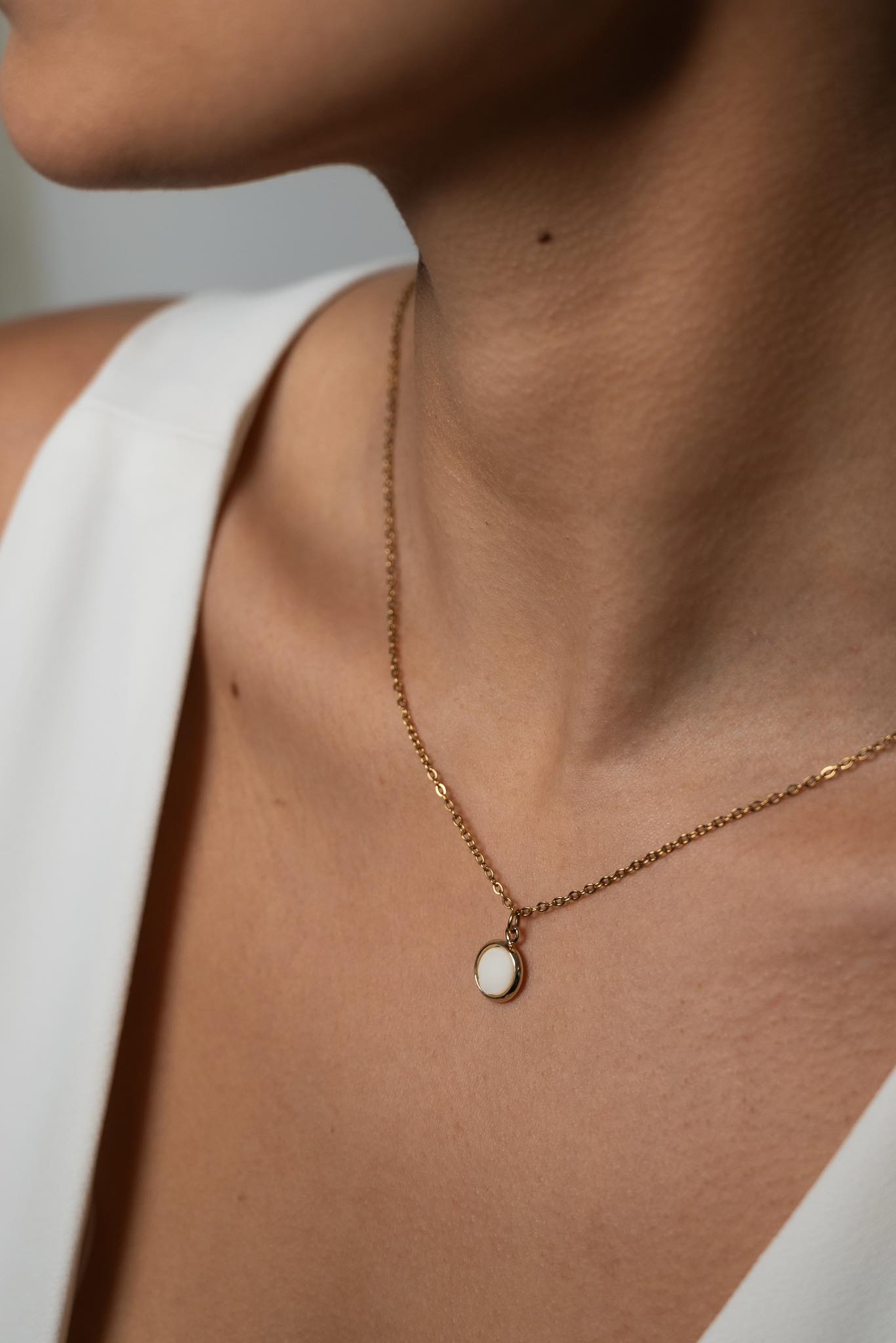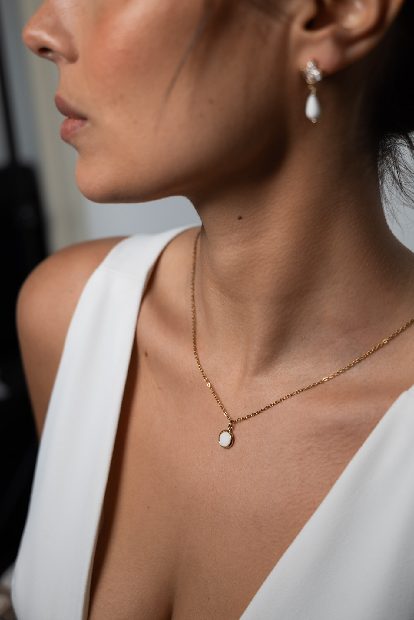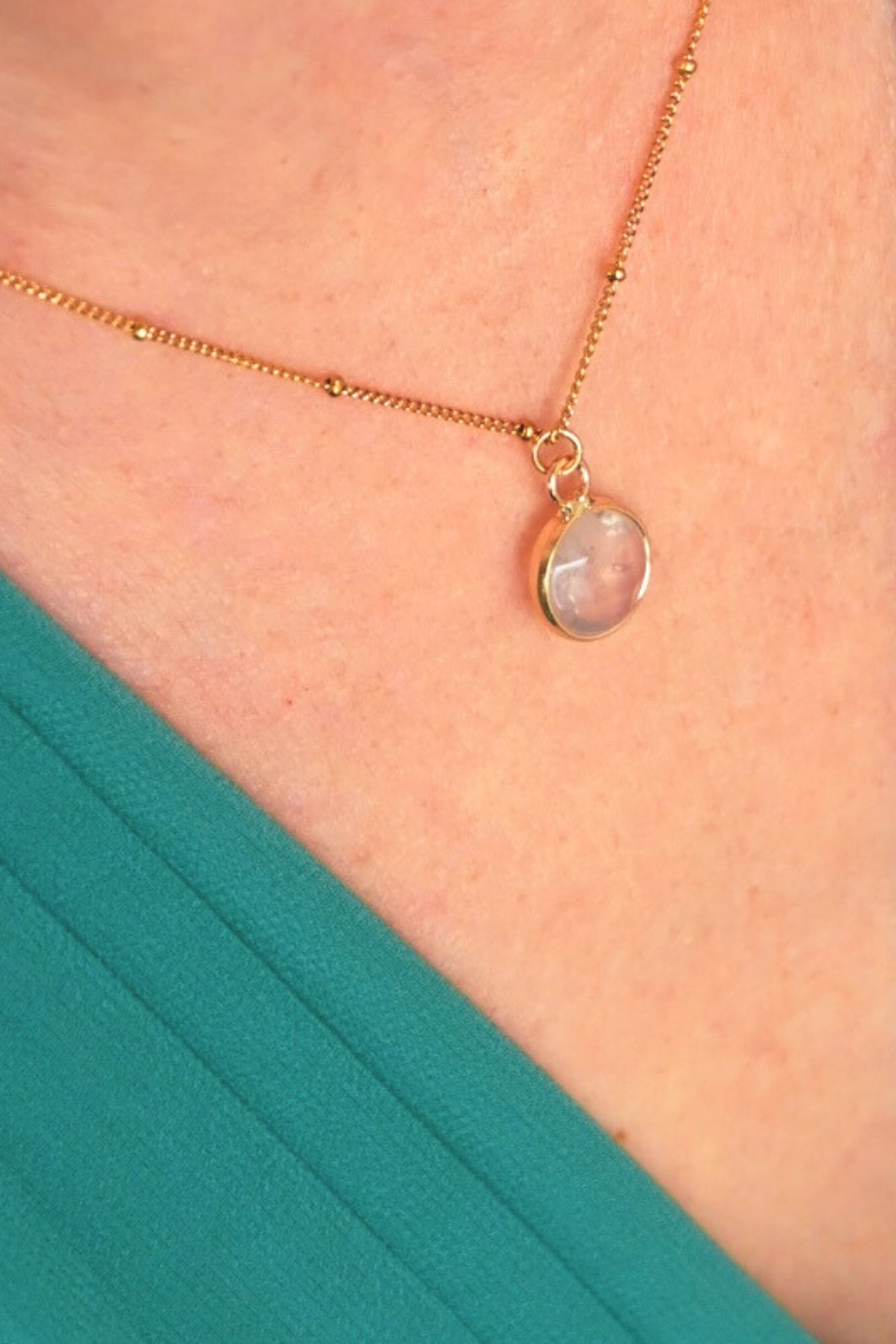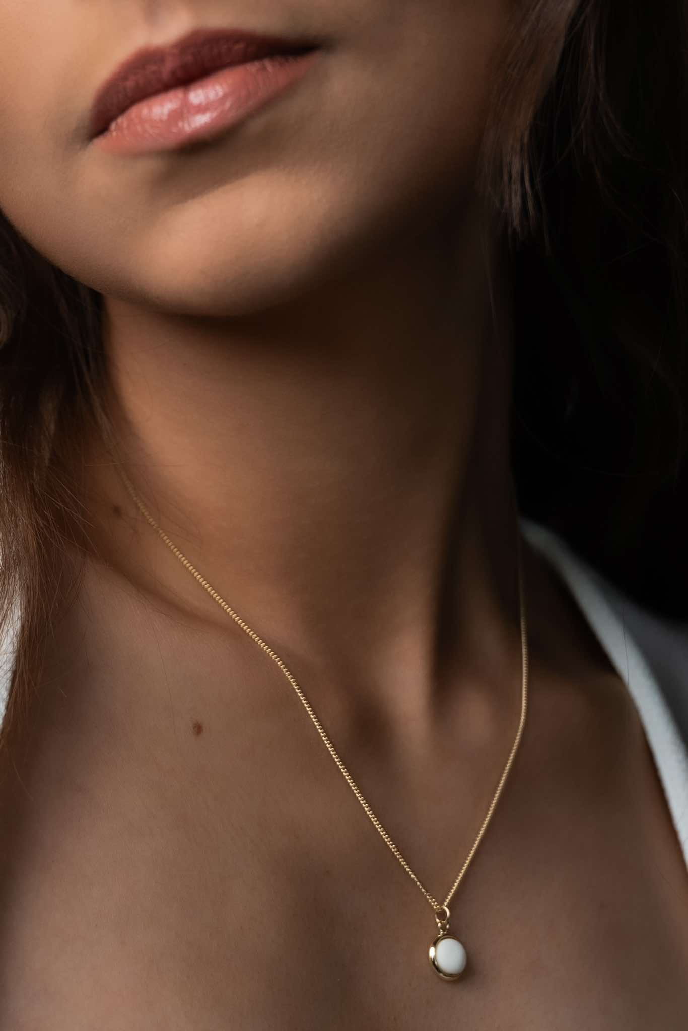 Pendentif rond doré et centre en porcelaine travaillée à la main – chainette avec petite perles de porcelaine (possibilité de les faire sur mesure) Parfait pour les robes au Décolleté plongeant