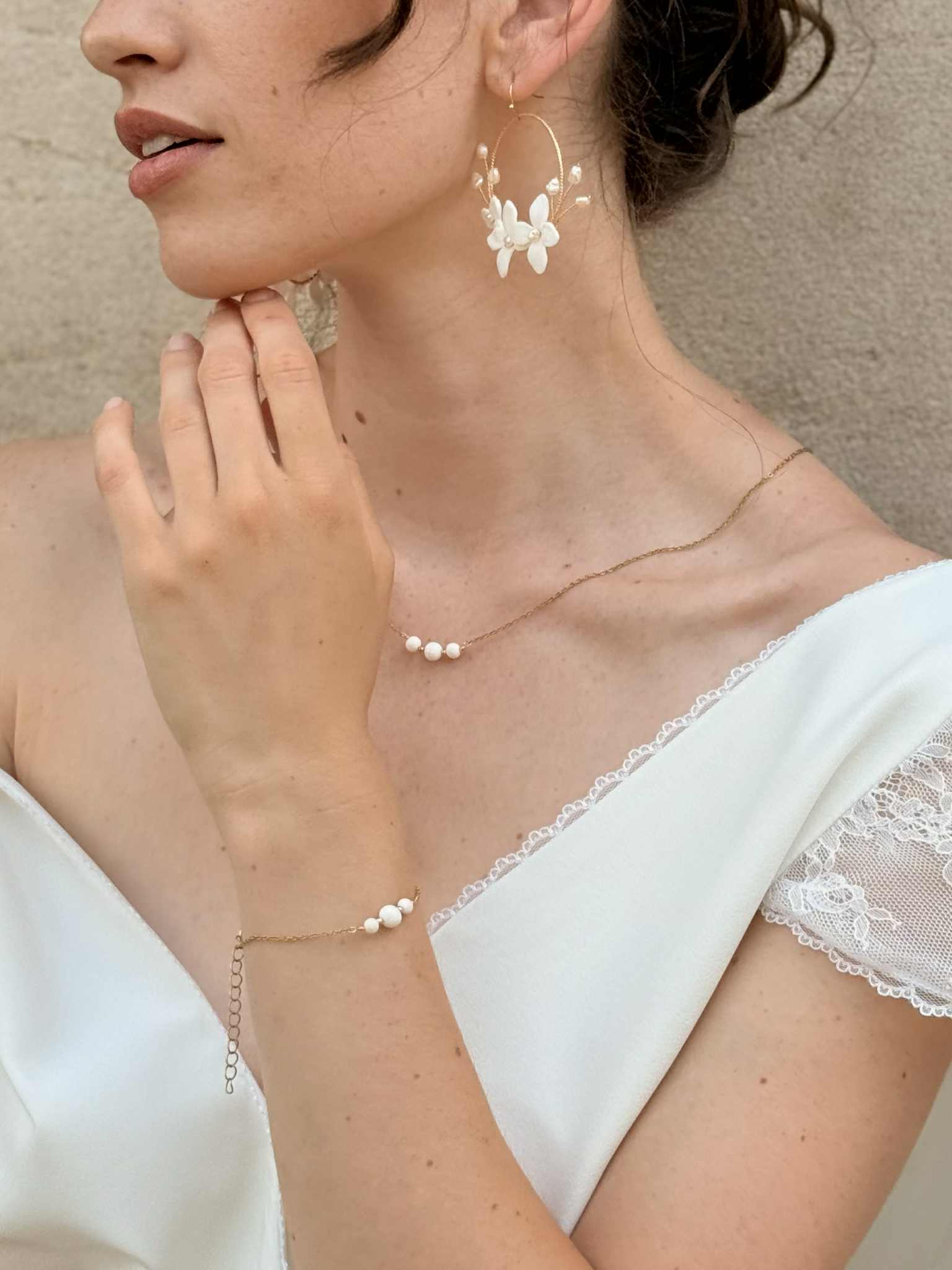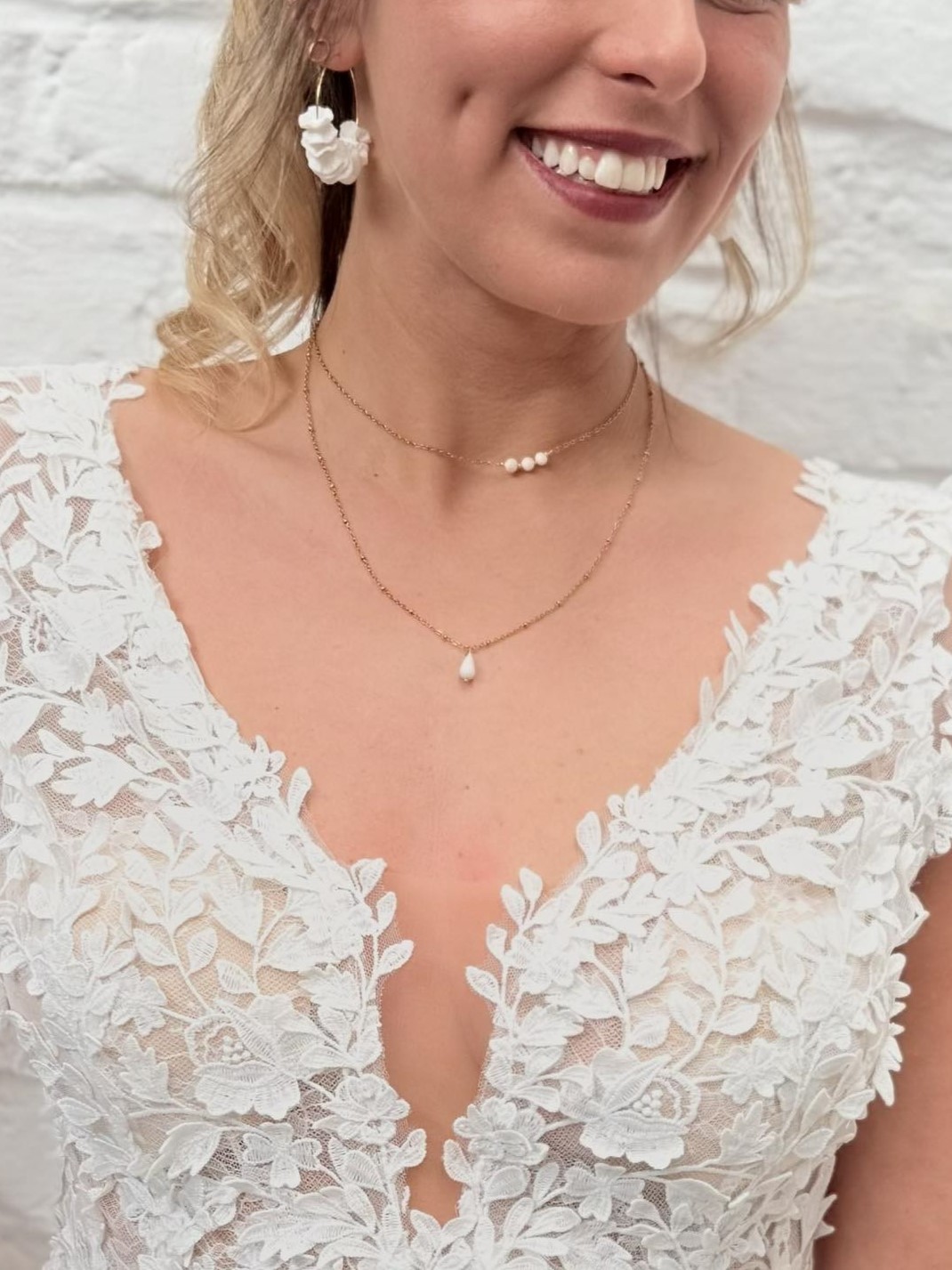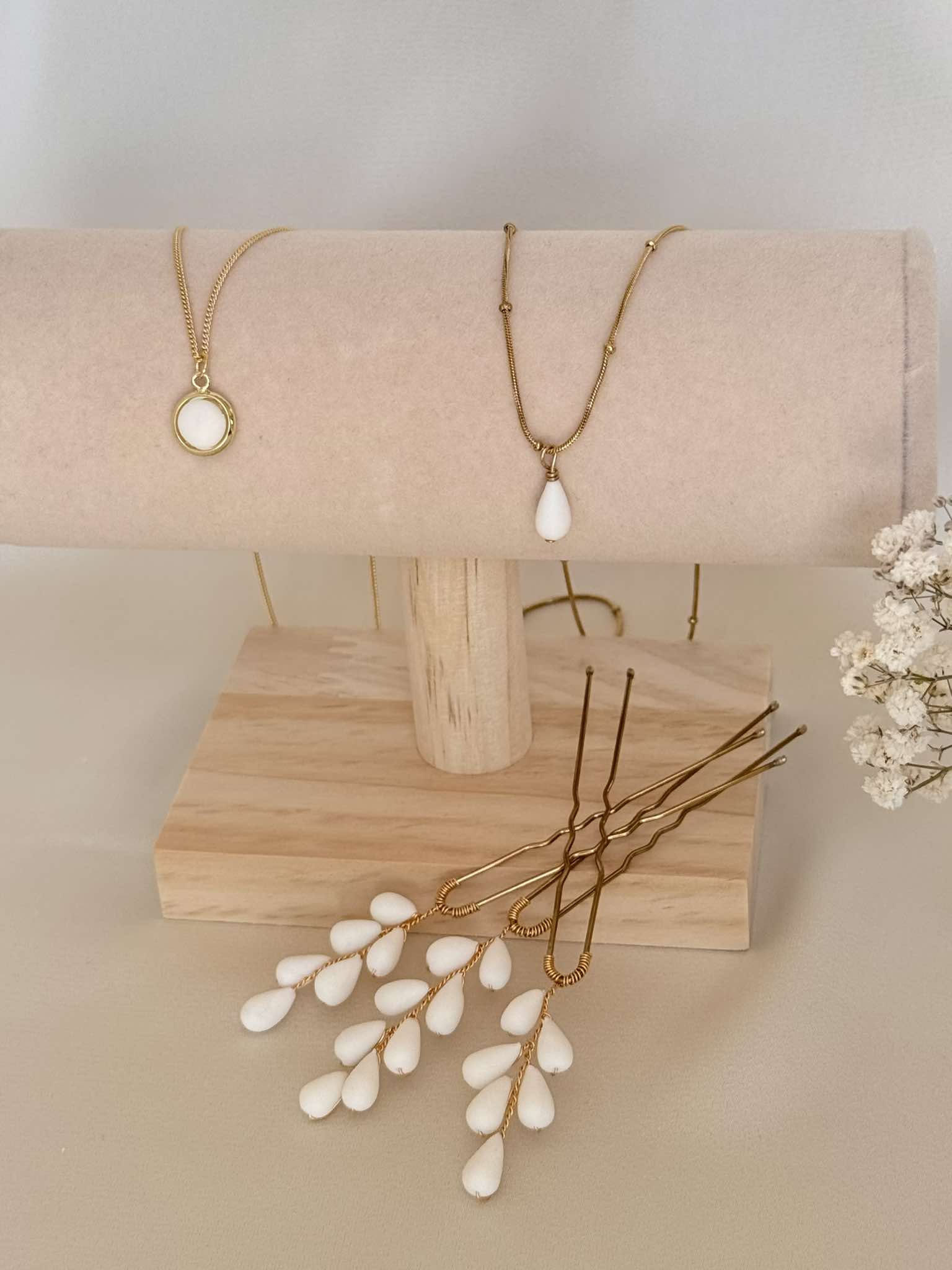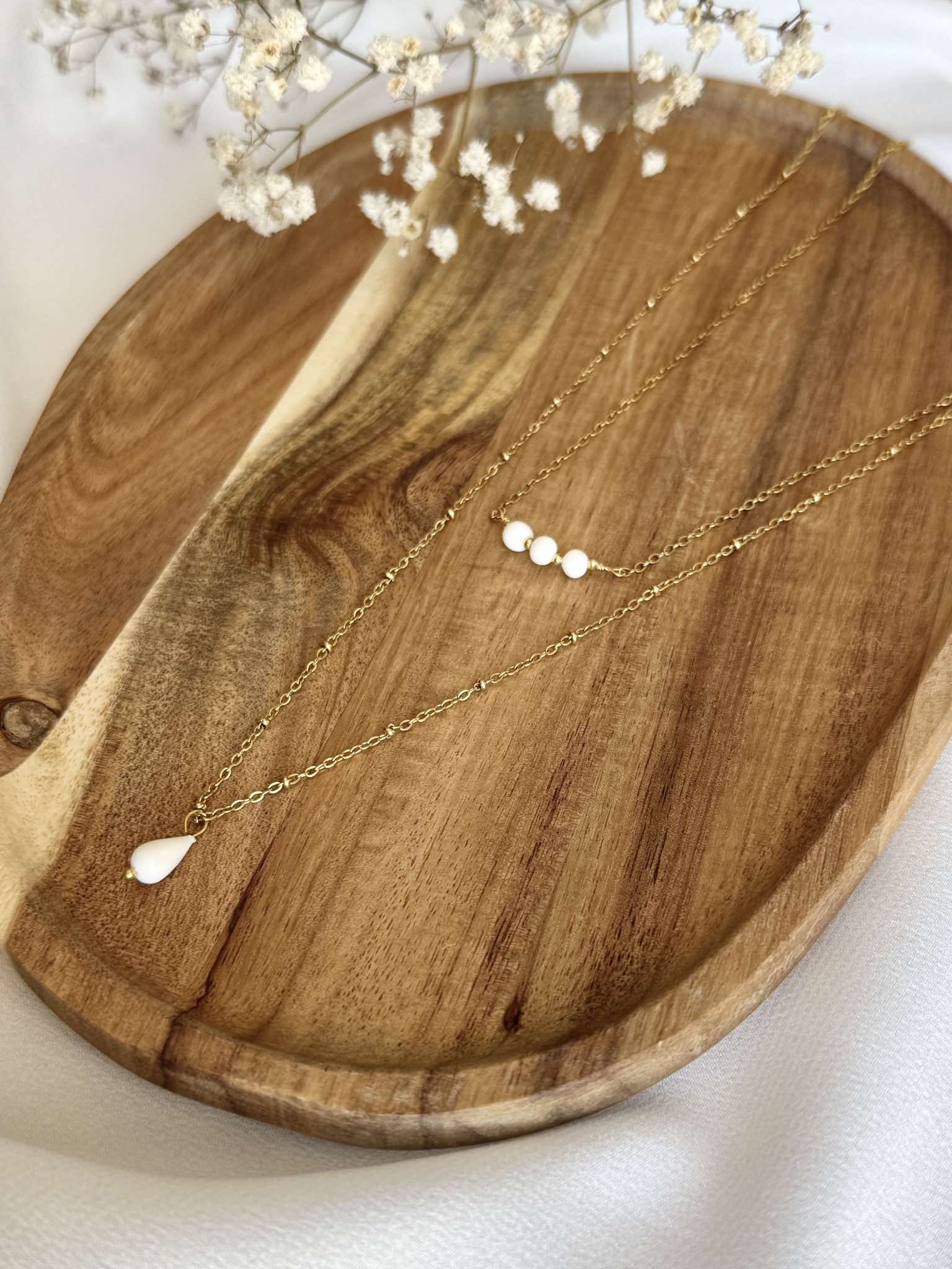 collier double – 3 Perles de porcelaine sculptée à la main & goutte – idée de bracelet assorti
