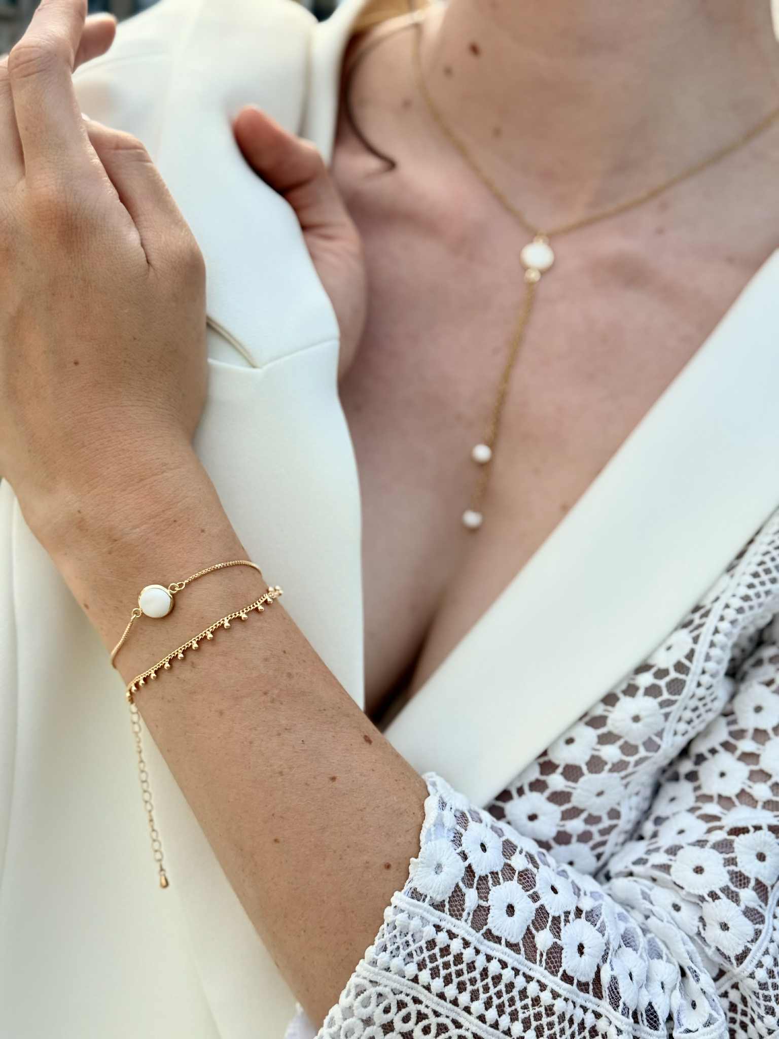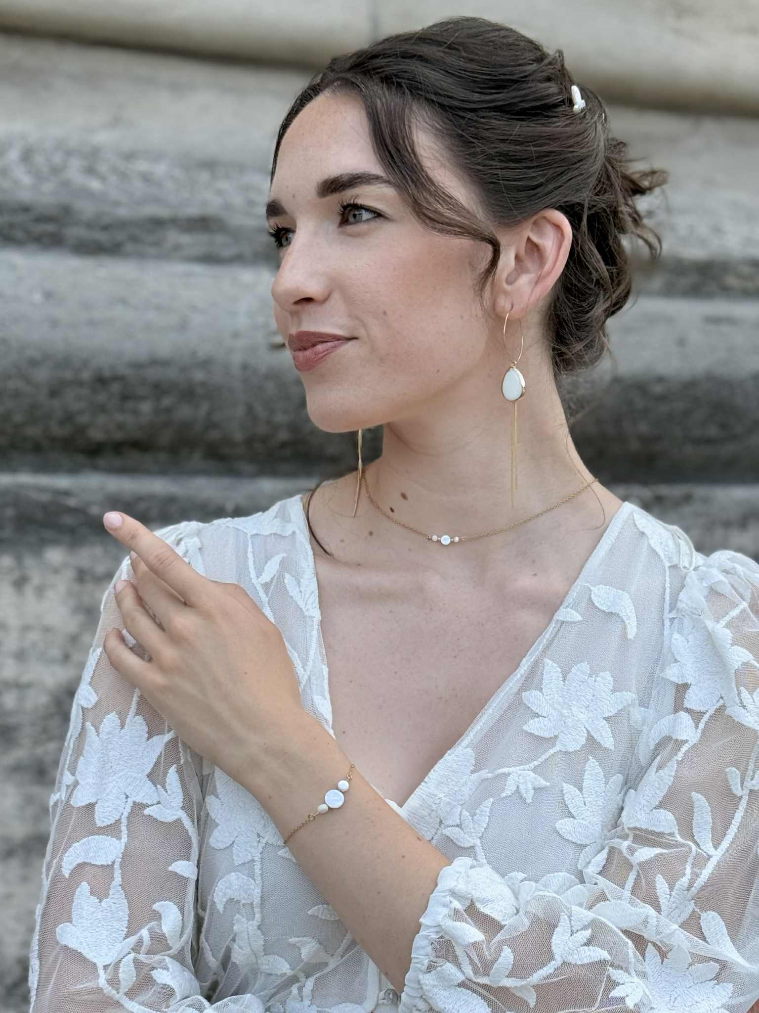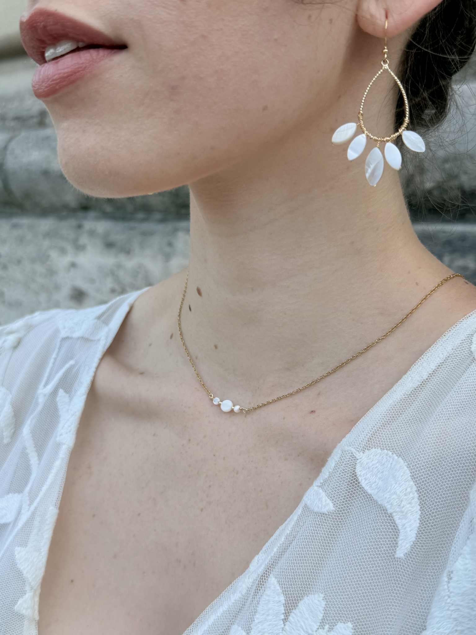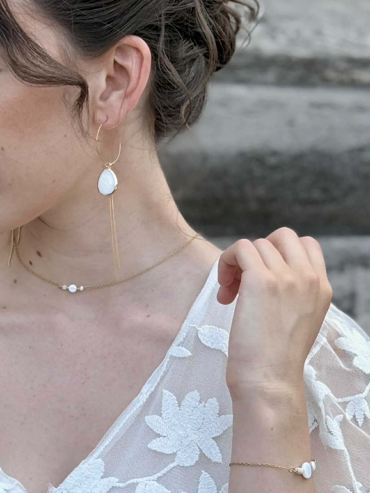 collier double – 3 Perles de porcelaine sculptée à la main & goutte – idée de bracelet assorti