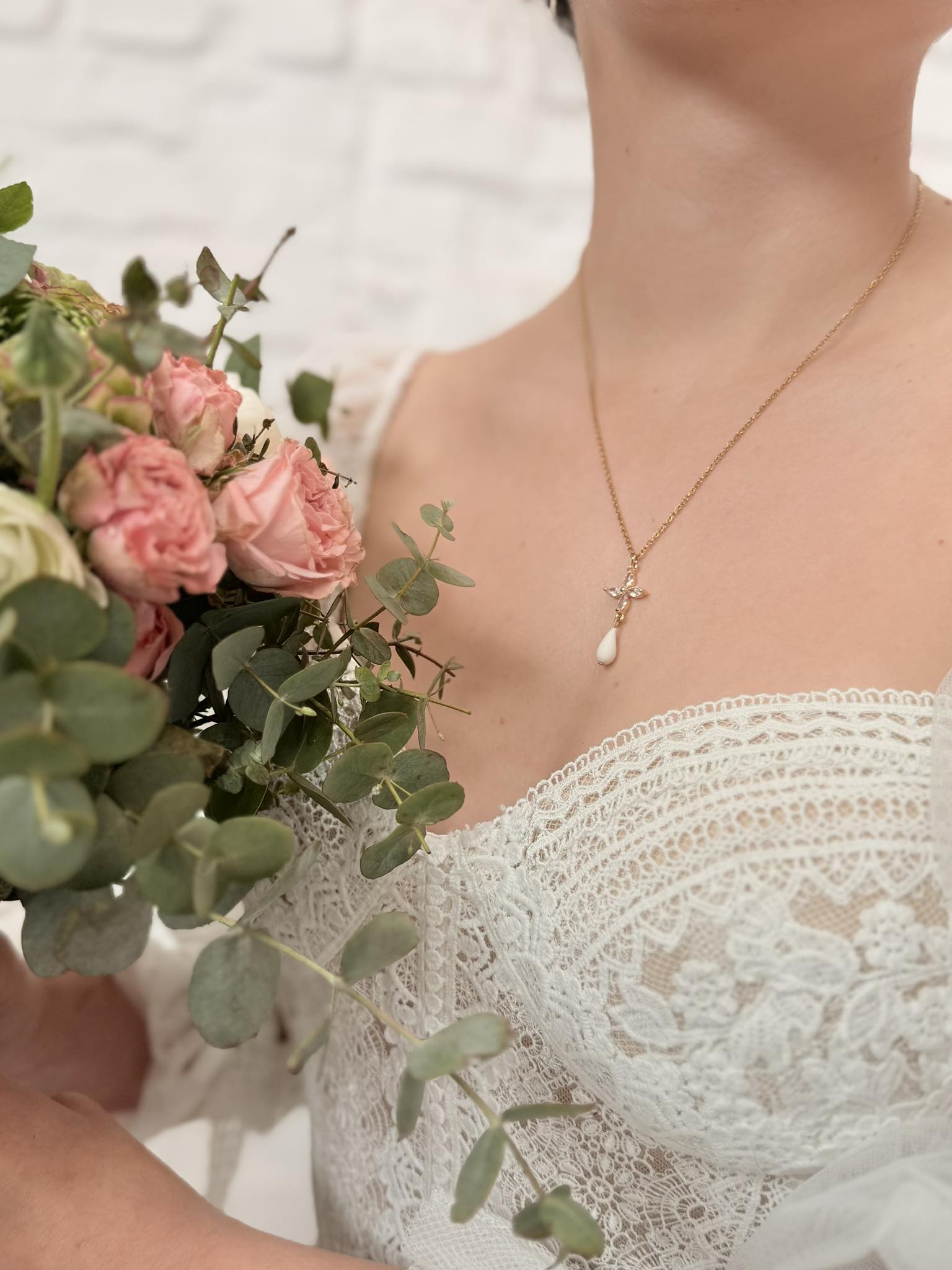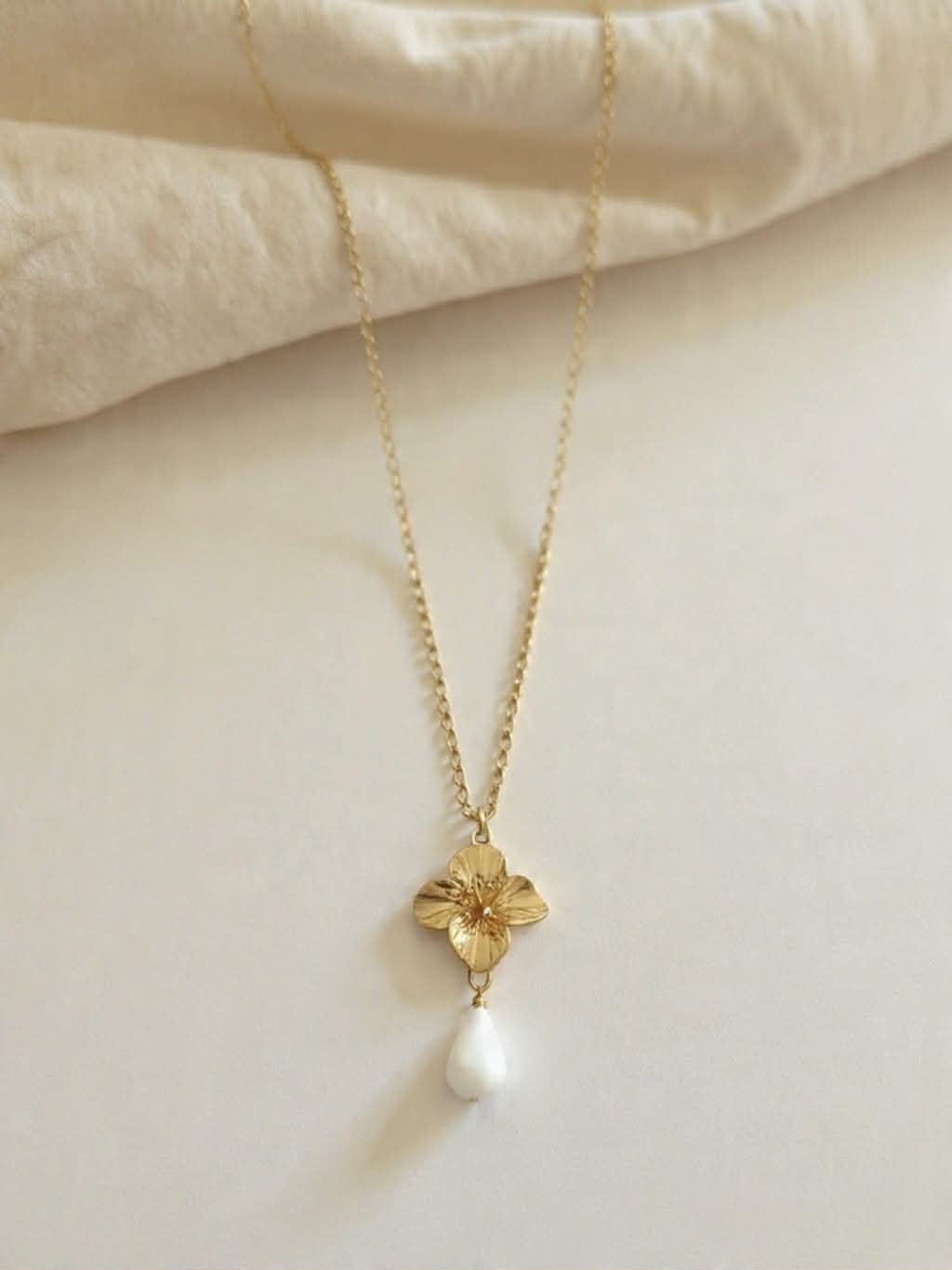 chaine Plaquée or 3 micron – Connecteur Fleur dorée – goutte de porcelaine sculptée à la main