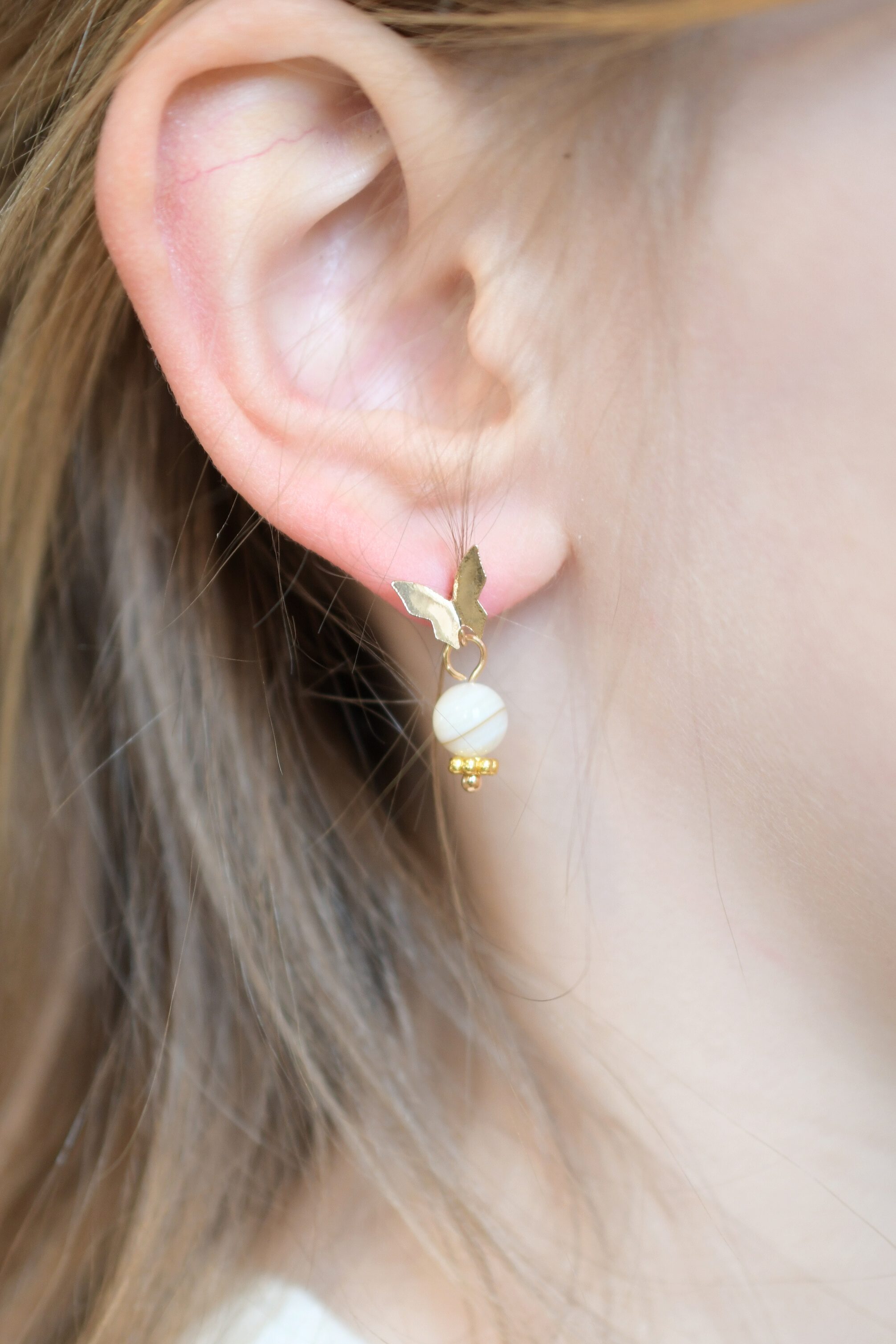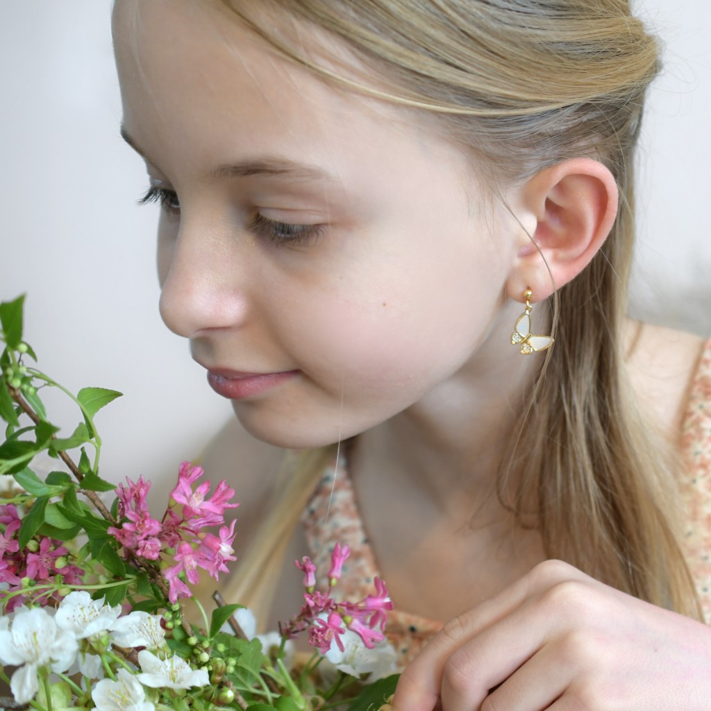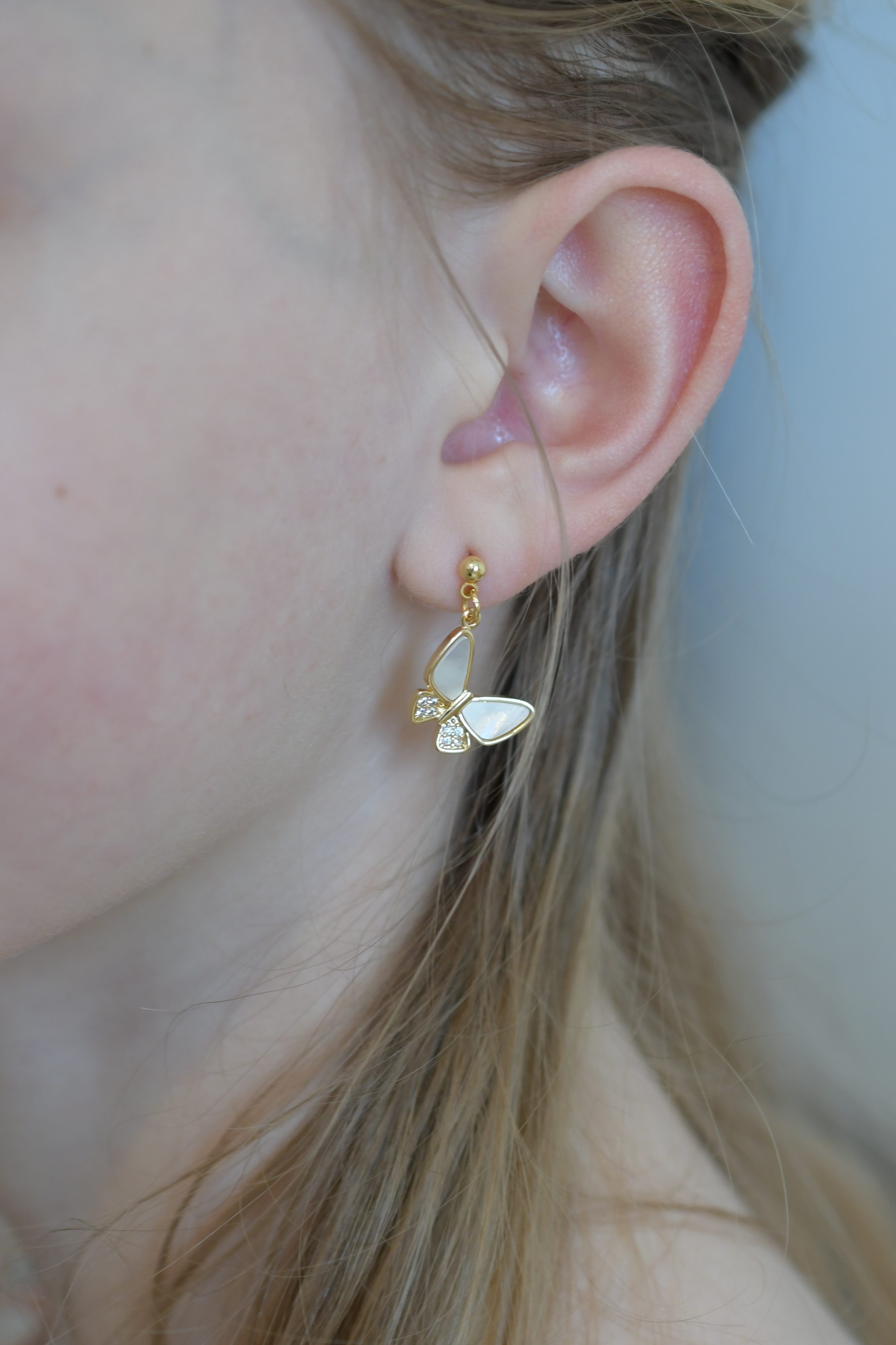 Tige en acier inoxydable plaqué or – papillon en nacre de coquillage et zirconium – 24 € –