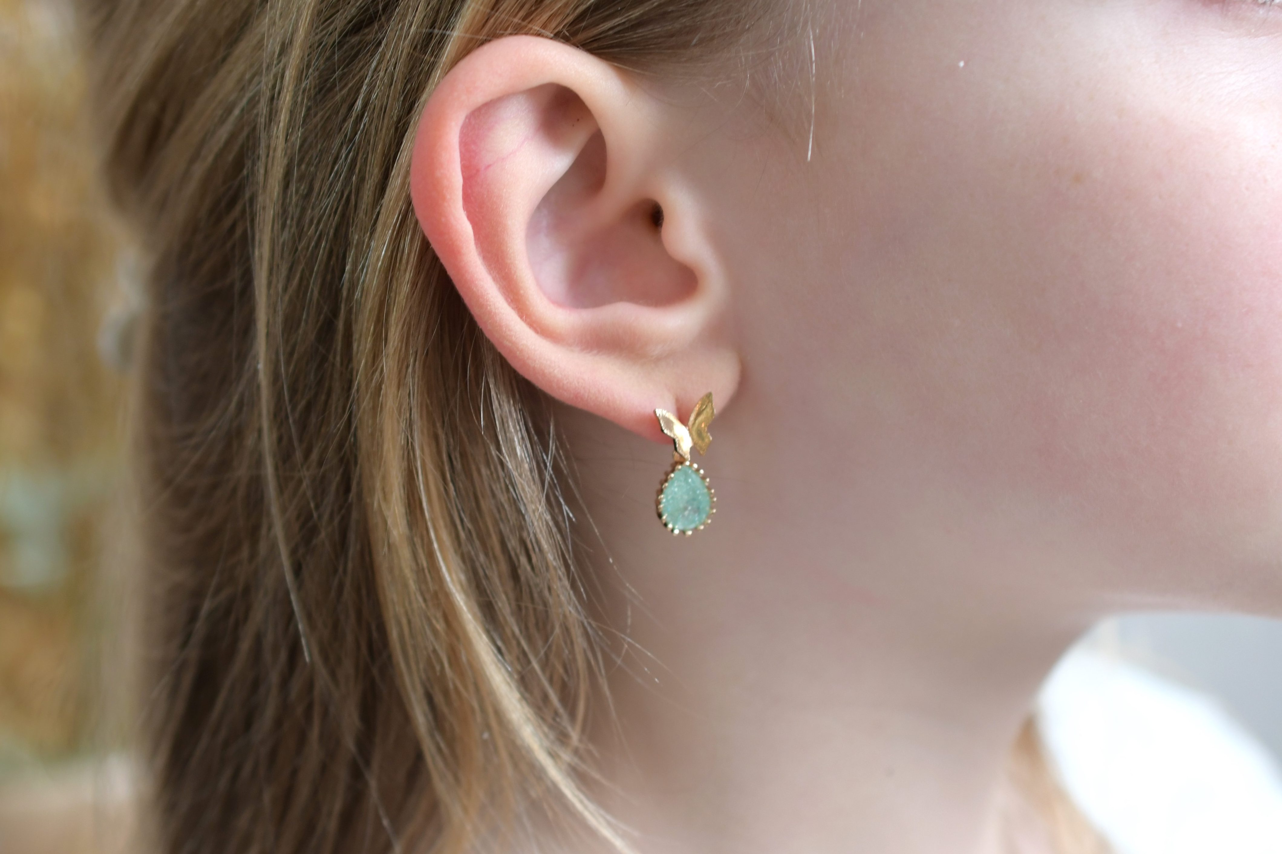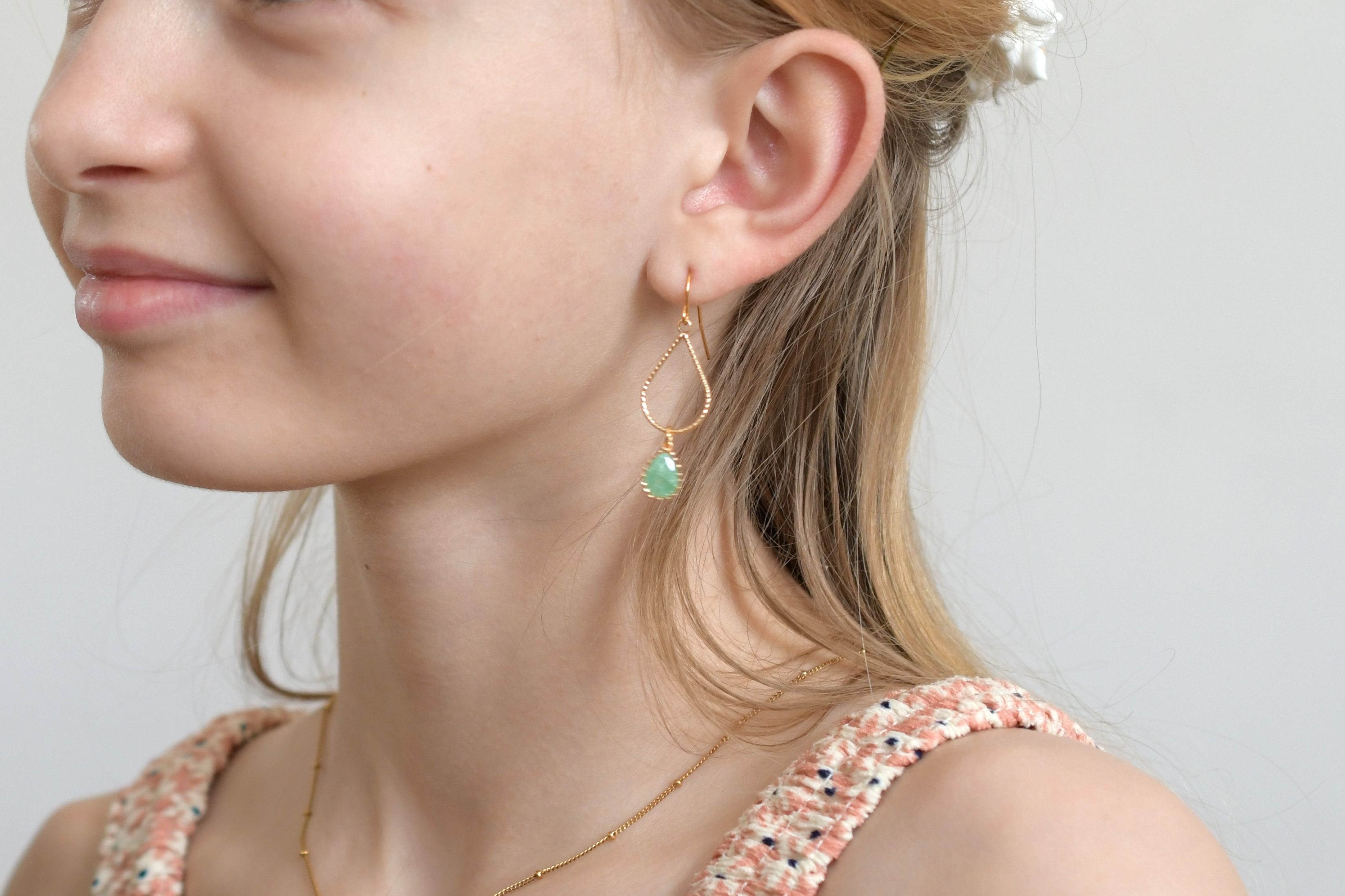 Crochet en acier inoxydable plaqué or – Elément goutte torsadée doré à l’or fin – goutte d’aventurine – 28 €-