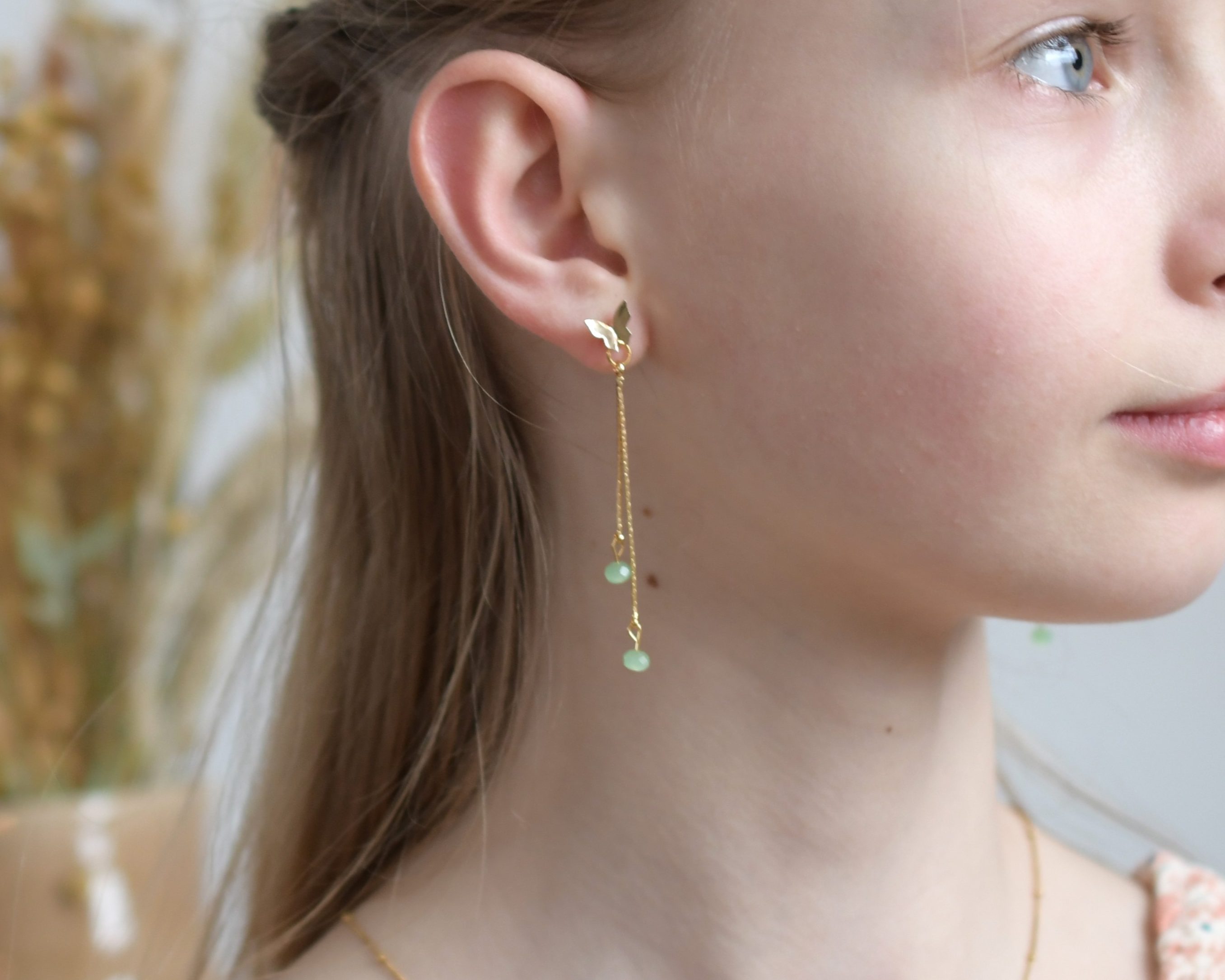 Tige en acier inoxydable plaqué or – goutte d’aventurine – 28 € –